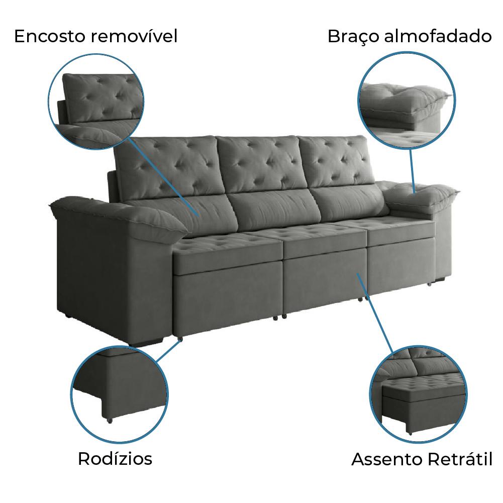 Sofá Retrátil 3 Lugares 2,10m York Suede Cinza