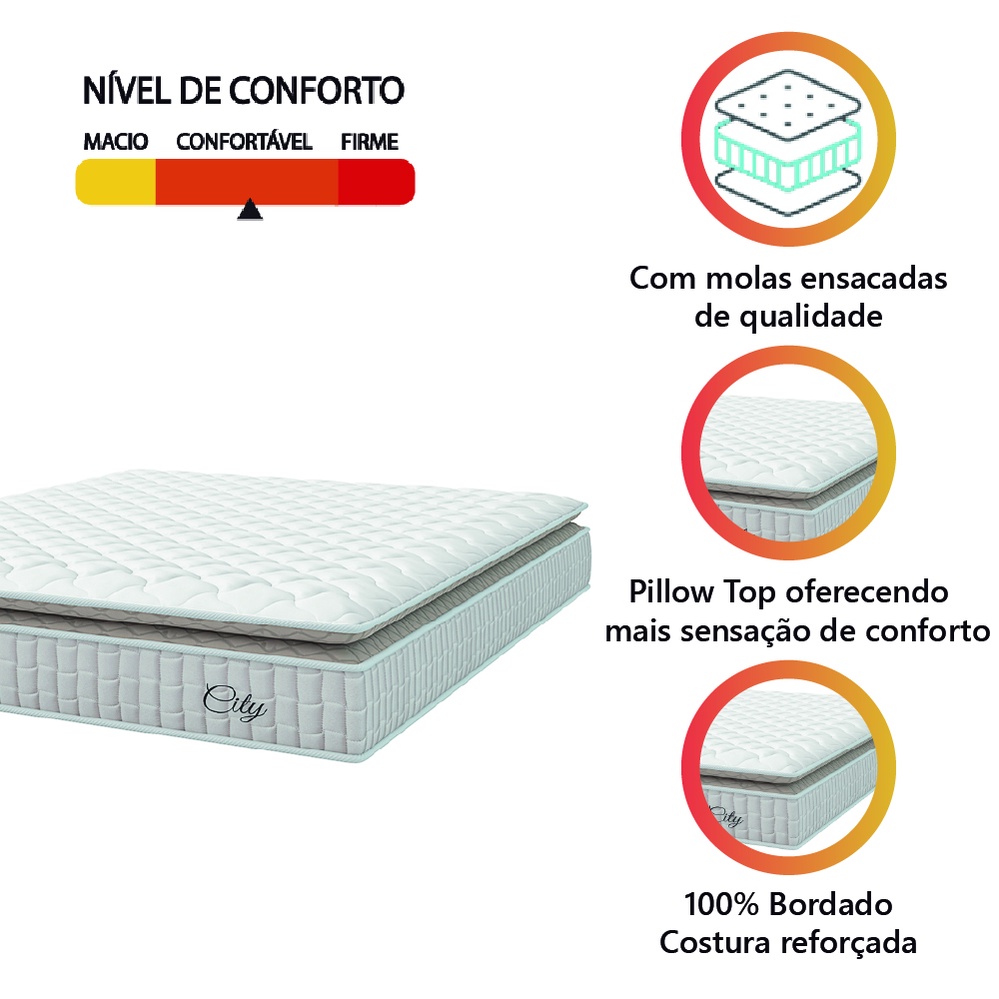 Colchão Casal King Molas Ensacadas City Pillow Top 193x203x23cm Branco / Bege Hellen - Suporta até 110kg por Pessoa