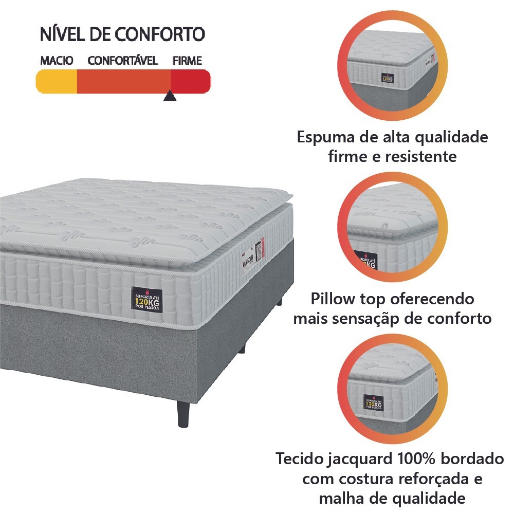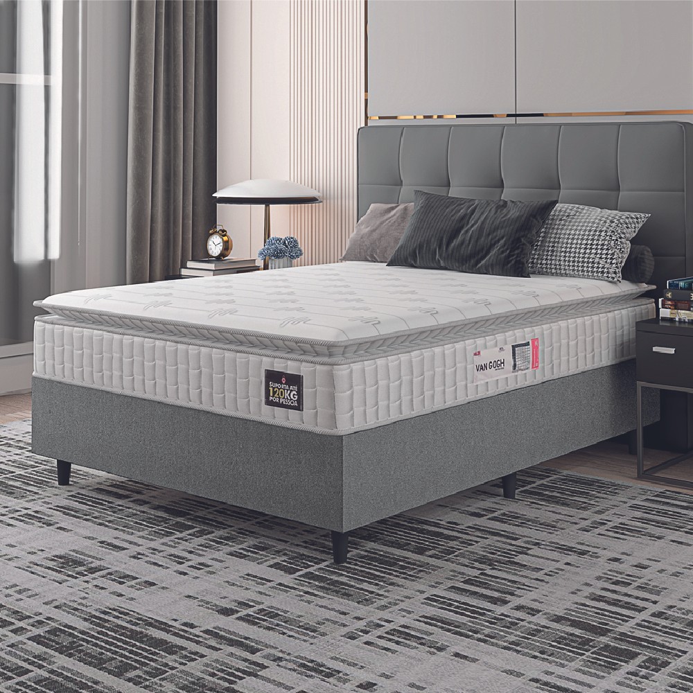 Cama Box Colchão Casal Espuma D33 Vangogh Pillow Top 138x188x67cm Branco / Cinza Hellen - Suporta até 120kg por Pessoa