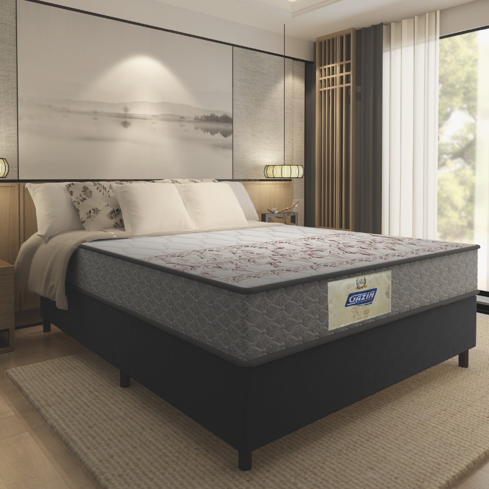 Cama Box Casal Colchão Molas Flora Gazin Cinza/Branco 138x188x60cm - Suporta Até 110 Kg Por Pessoa