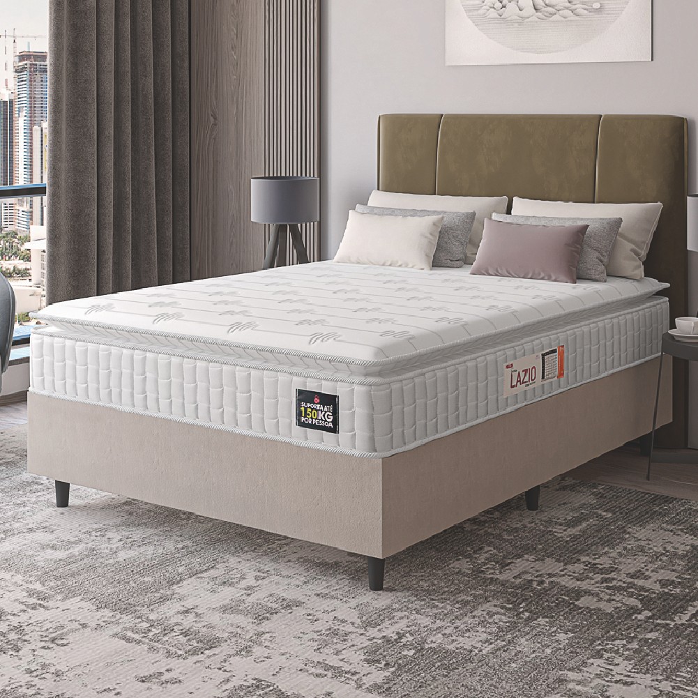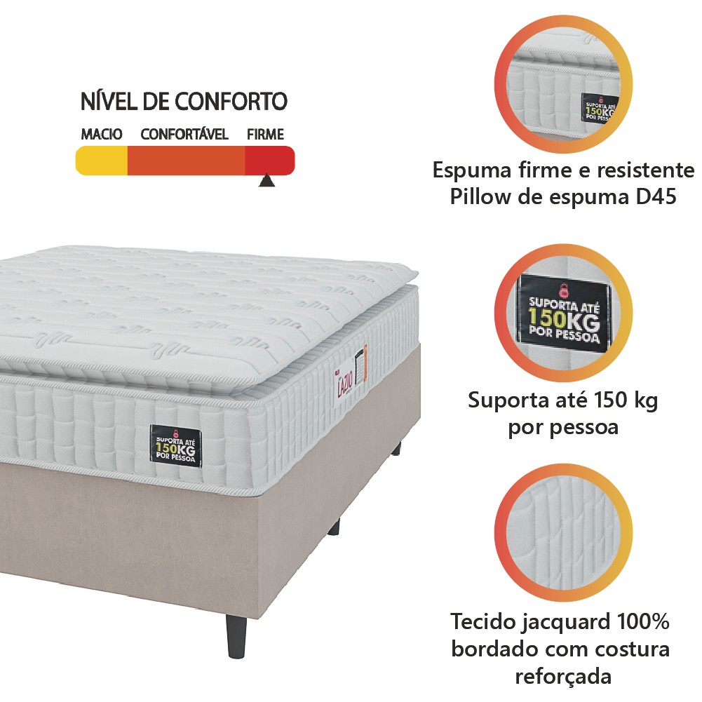 Cama Box Casal Colchão Espuma D45 Lazio Pillow Top 138x188x62cm Suede Branco/Bege Hellen