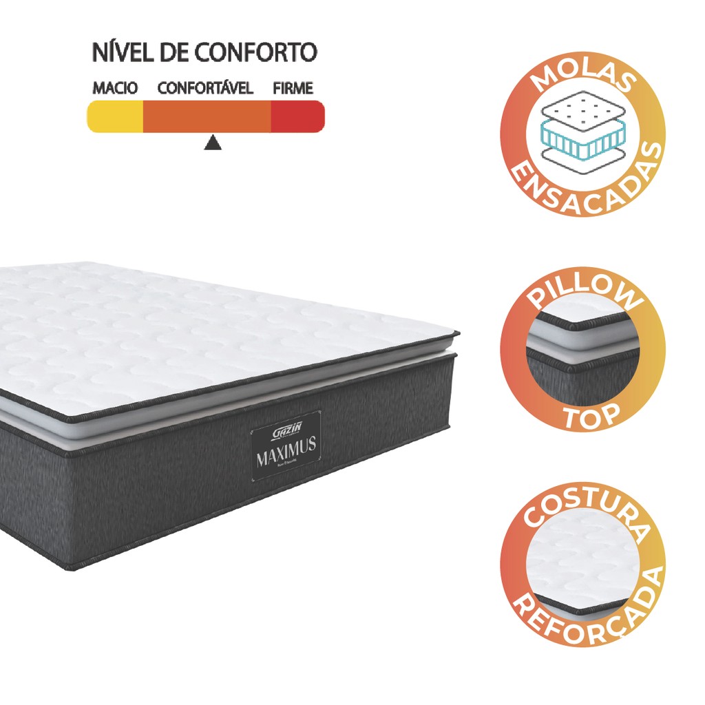 Colchão Casal Queen Molas Ensacadas Pillow Top Maximus 158x198x28cm Cinza/Branco Gazin - Suporta até
