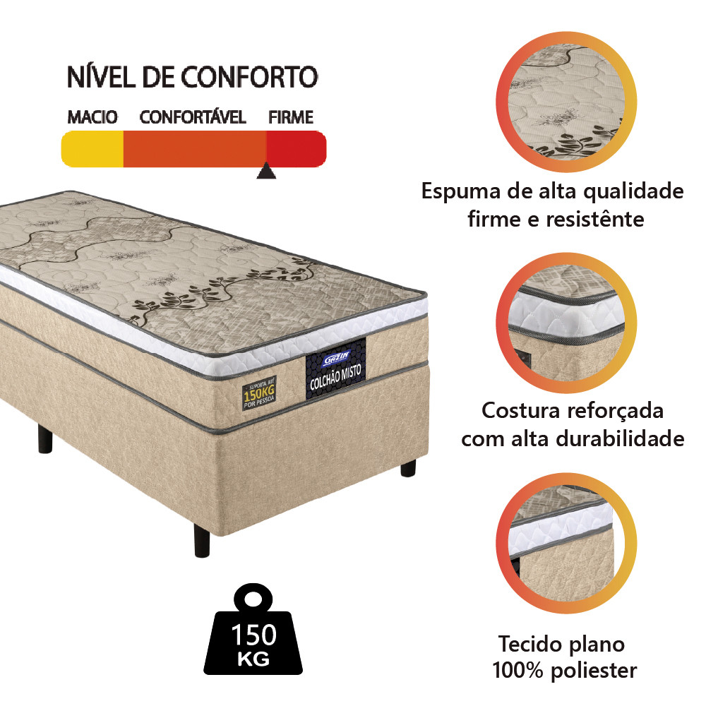 Cama Box Solteiro Colchão Espuma D33 Fort Gazin 88x188x59cm Bege/Branco-Suporta até 150kg por Pessoa