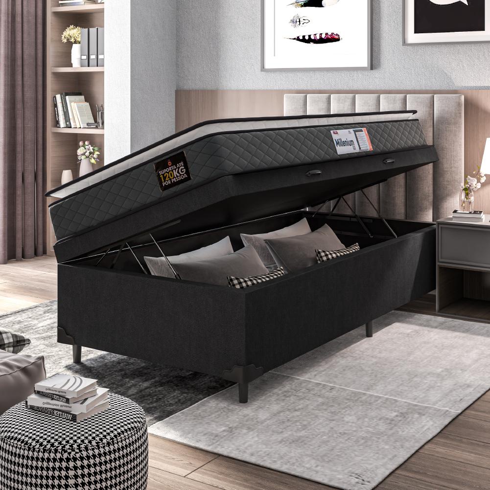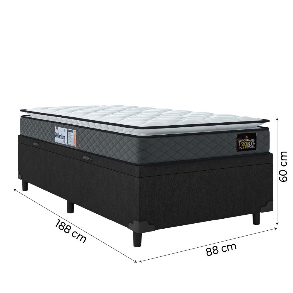 Cama Box Baú Solteiro Colchão Espuma D33 Pillow Top Millenium 88x188x60cm Cinza/Preto Hellen - Supor