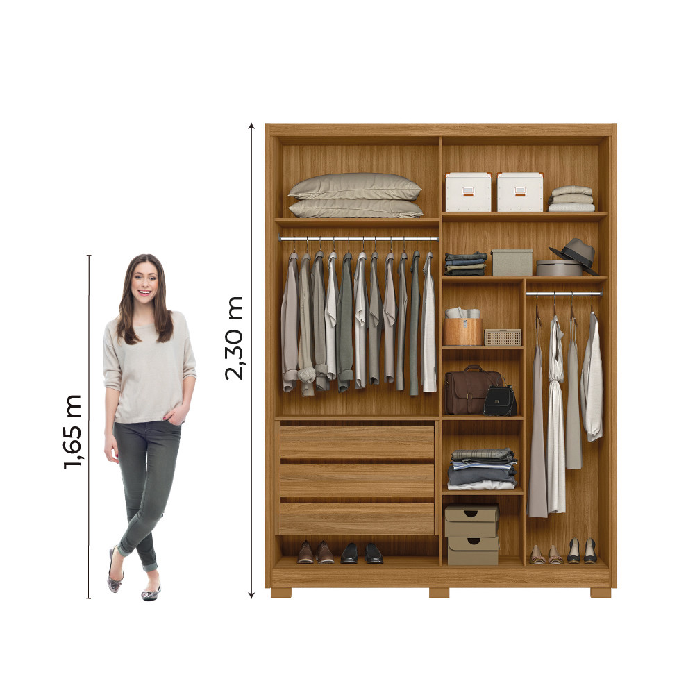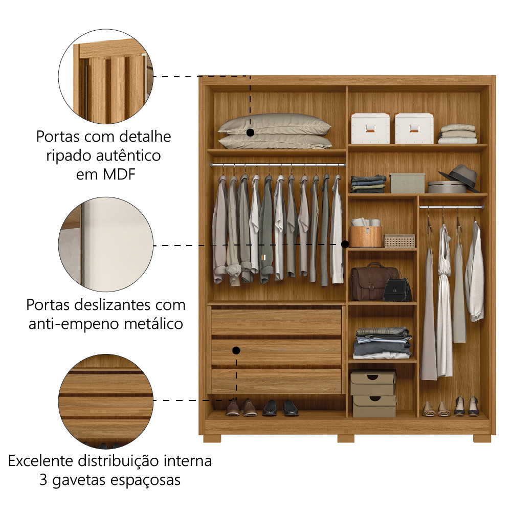 Guarda Roupas Solteiro Com Espelho Ripado 2 Portas 3 Gavetas Freijó/Off White Colorado Moval