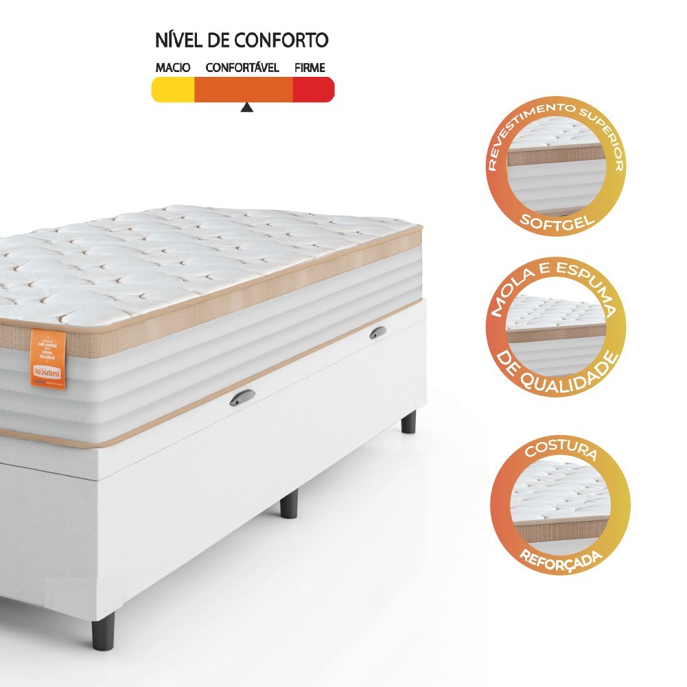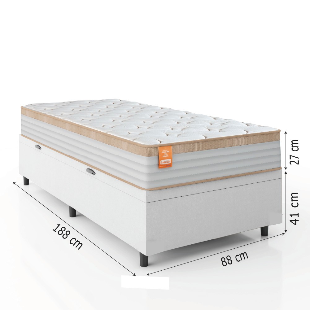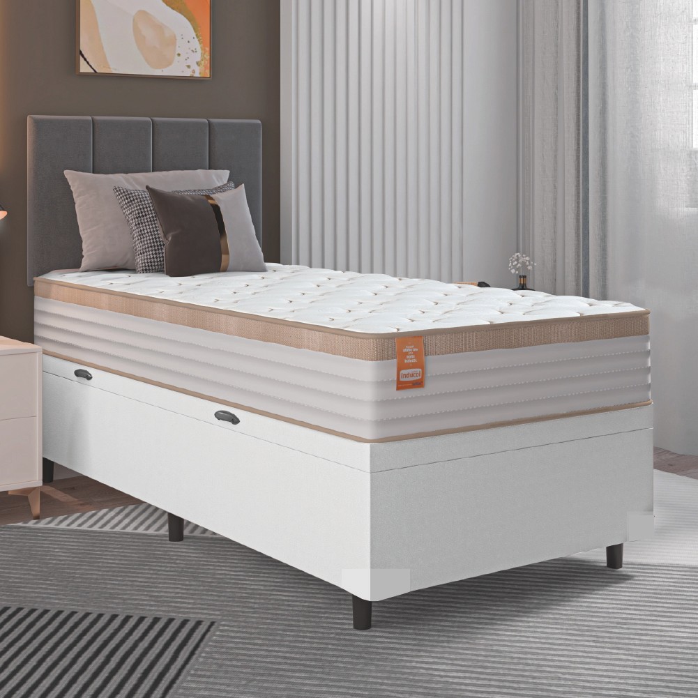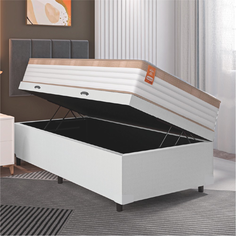 Cama Box Baú Colchão Solteiro Molas Ensacadas Real 88x188x68cm Linho Branco / Bege Inducol