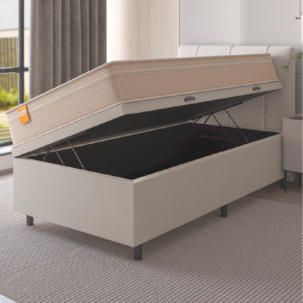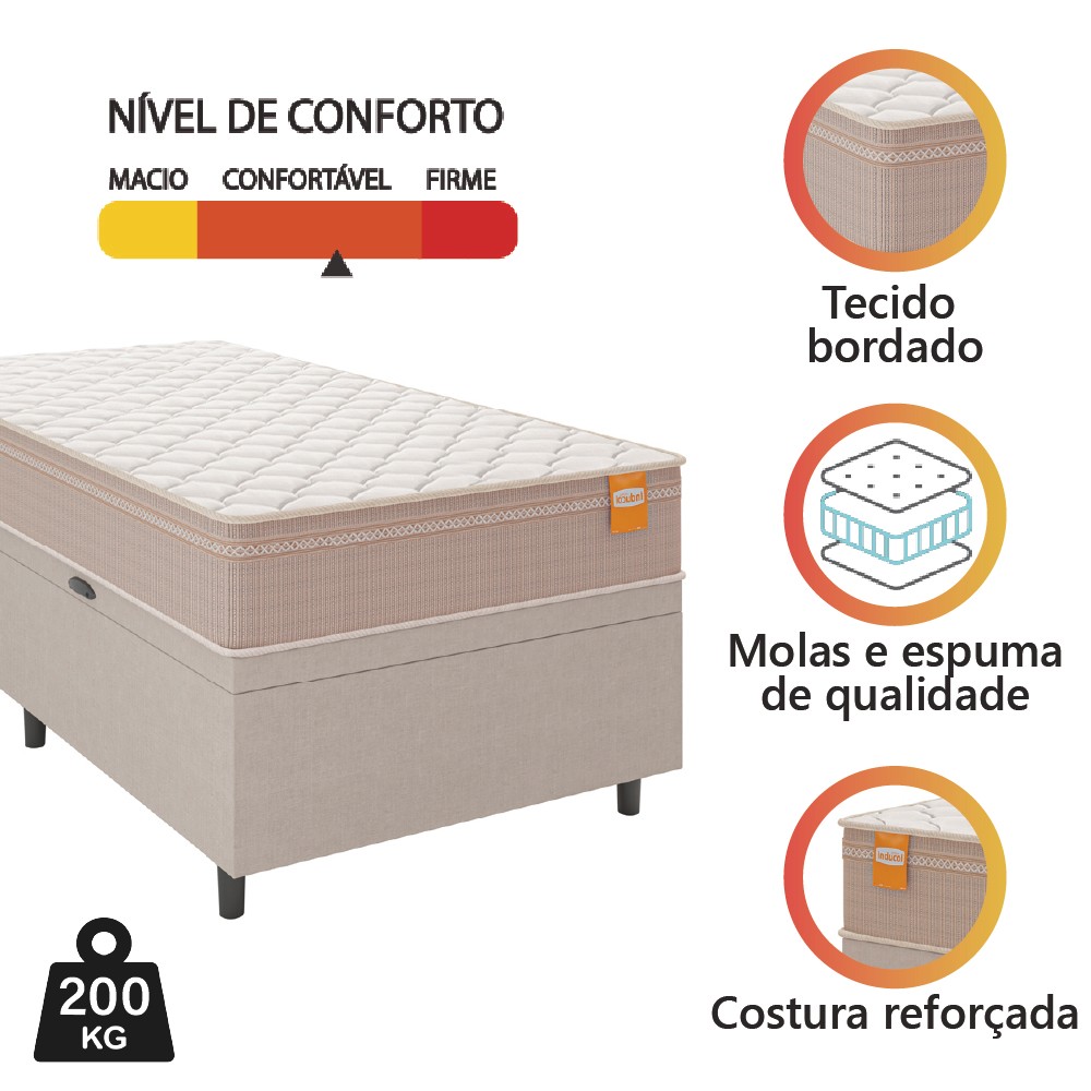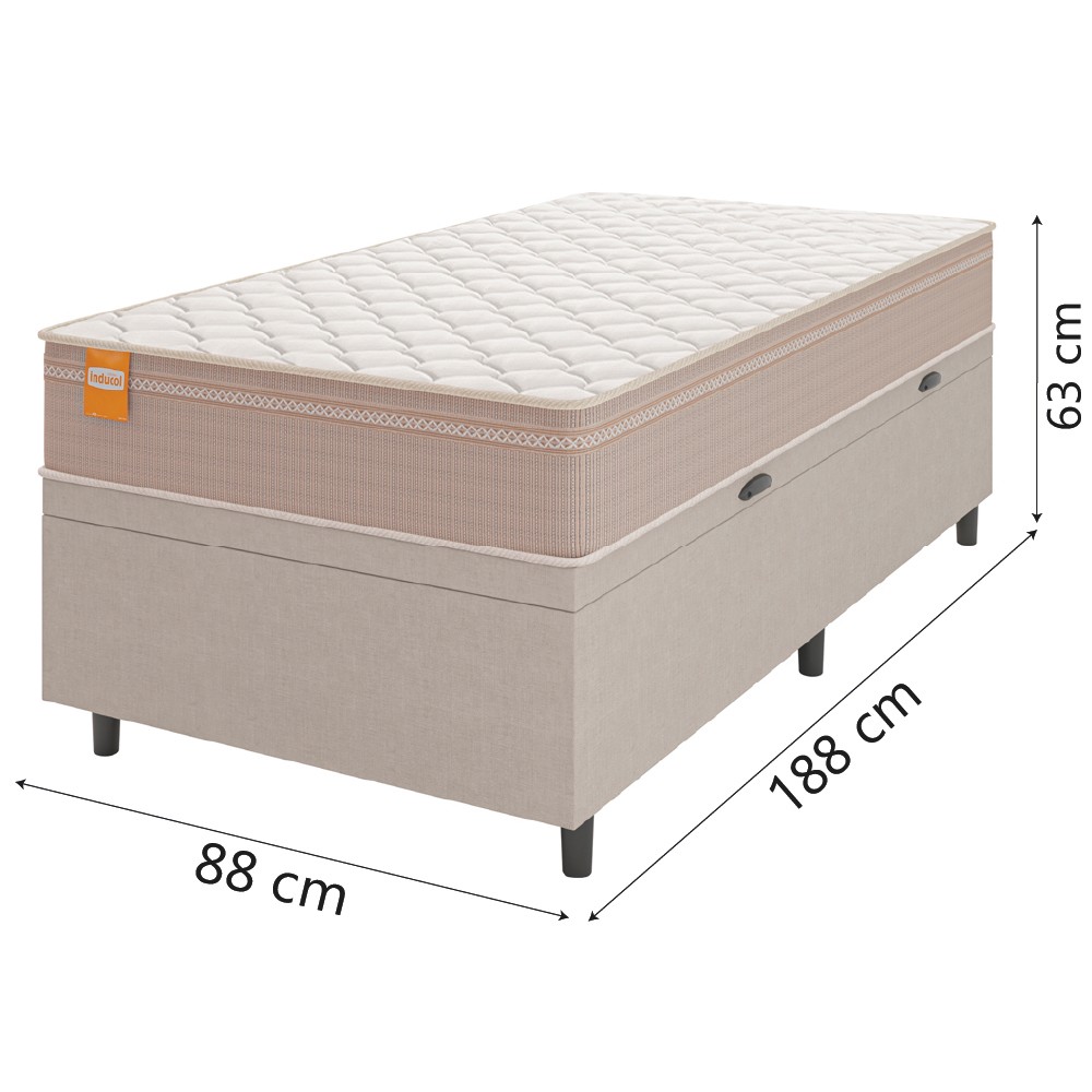 Cama Box Baú Solteiro Colchão Molas Qatar 88x188x63cm Bege/Branco Inducol - Suporta Até 200 Kg Por Pessoa