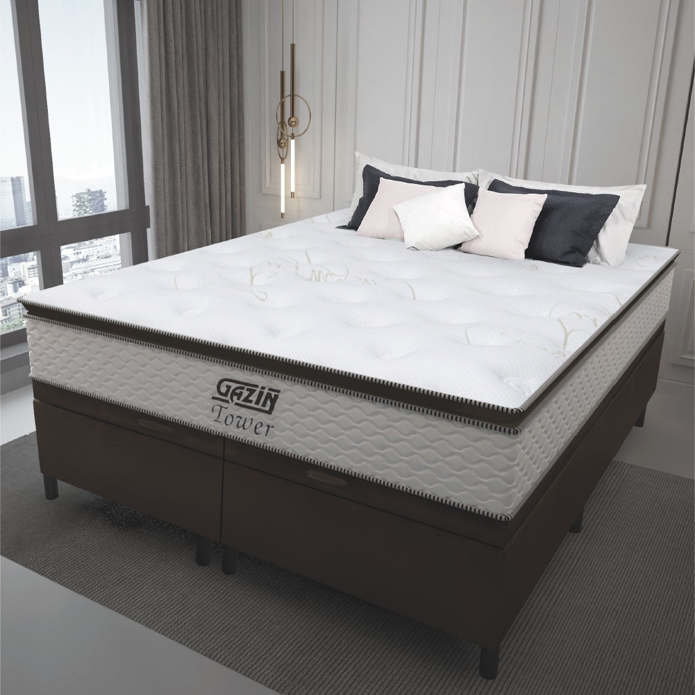 Cama Box Baú King Gazin Colchão Molas Ensacadas Com Pillow Top Tower 193x203x75cm Branco/Marrom