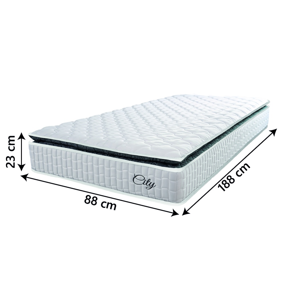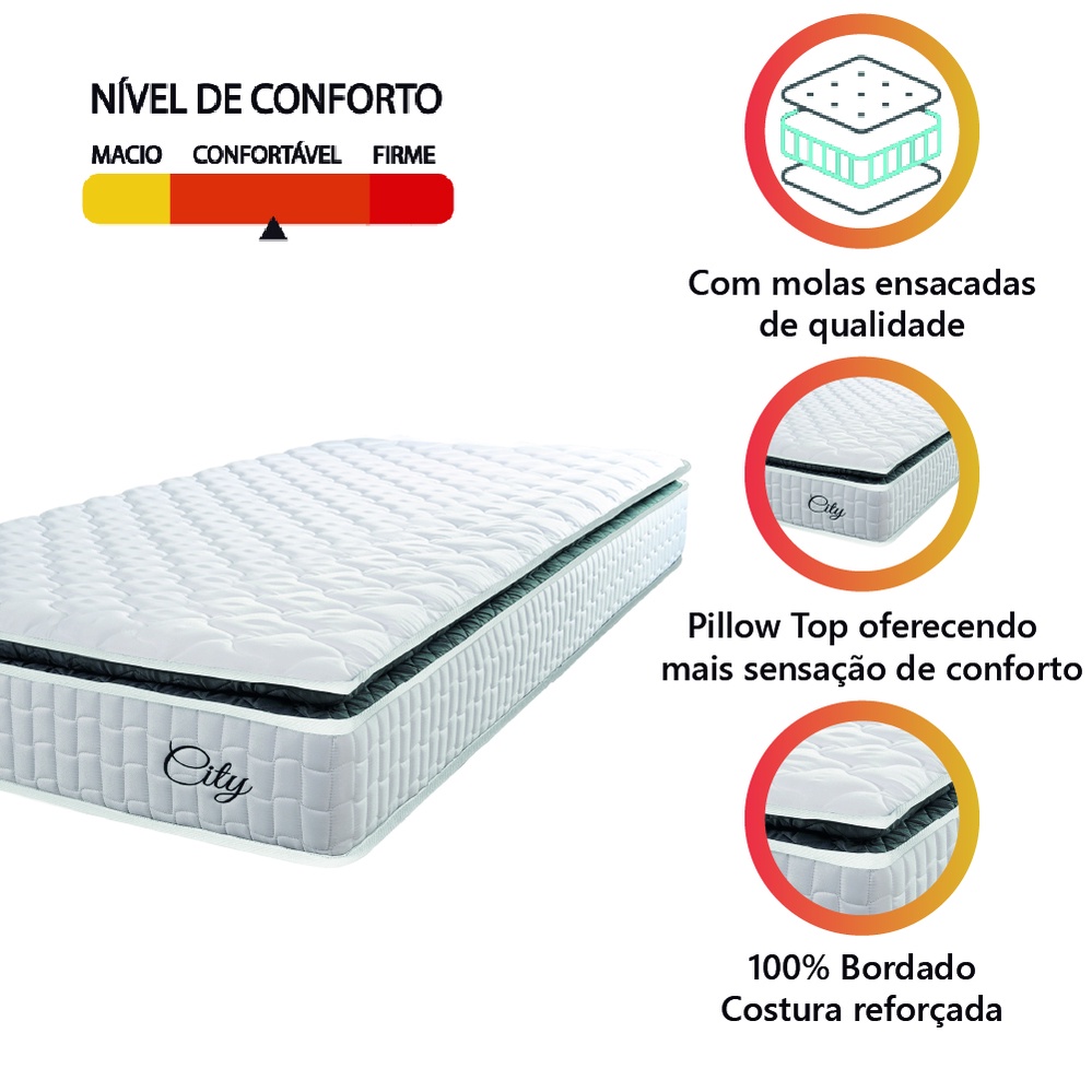 Colchão Solteiro Molas Ensacadas City Pillow Top 88x188x23cm Branco/Preto Hellen - Suporta até 110kg por Pessoa