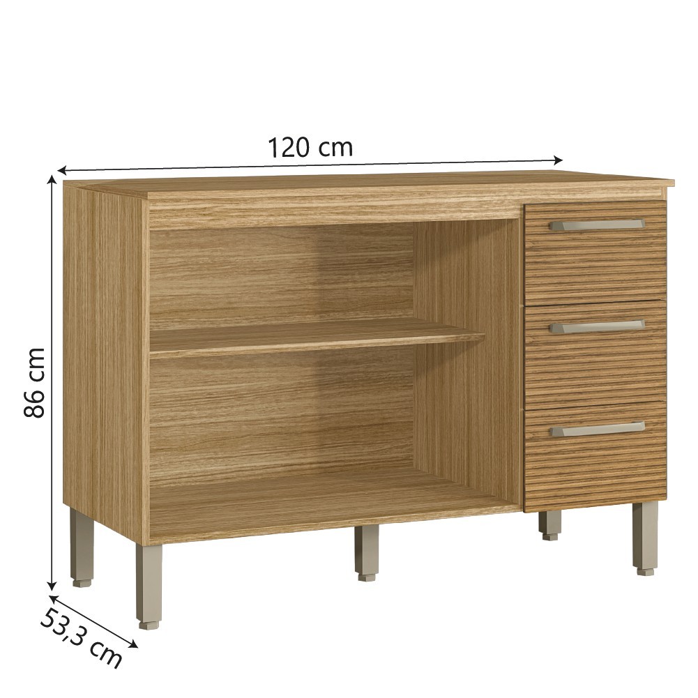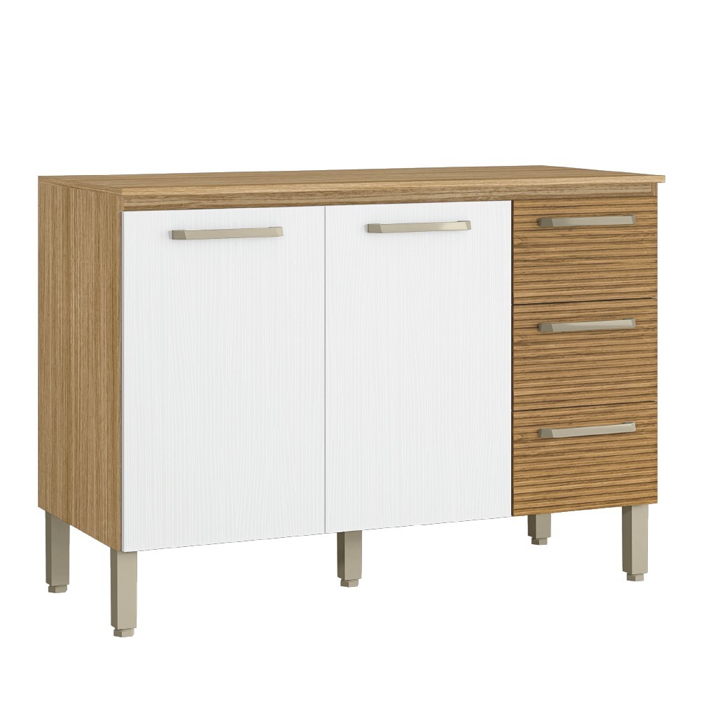 Balcão de Cozinha Triplo Ripado Com Tampo 2 Portas 3 Gavetas 1,20m Madeirado / Branco Ametista Kits Paraná