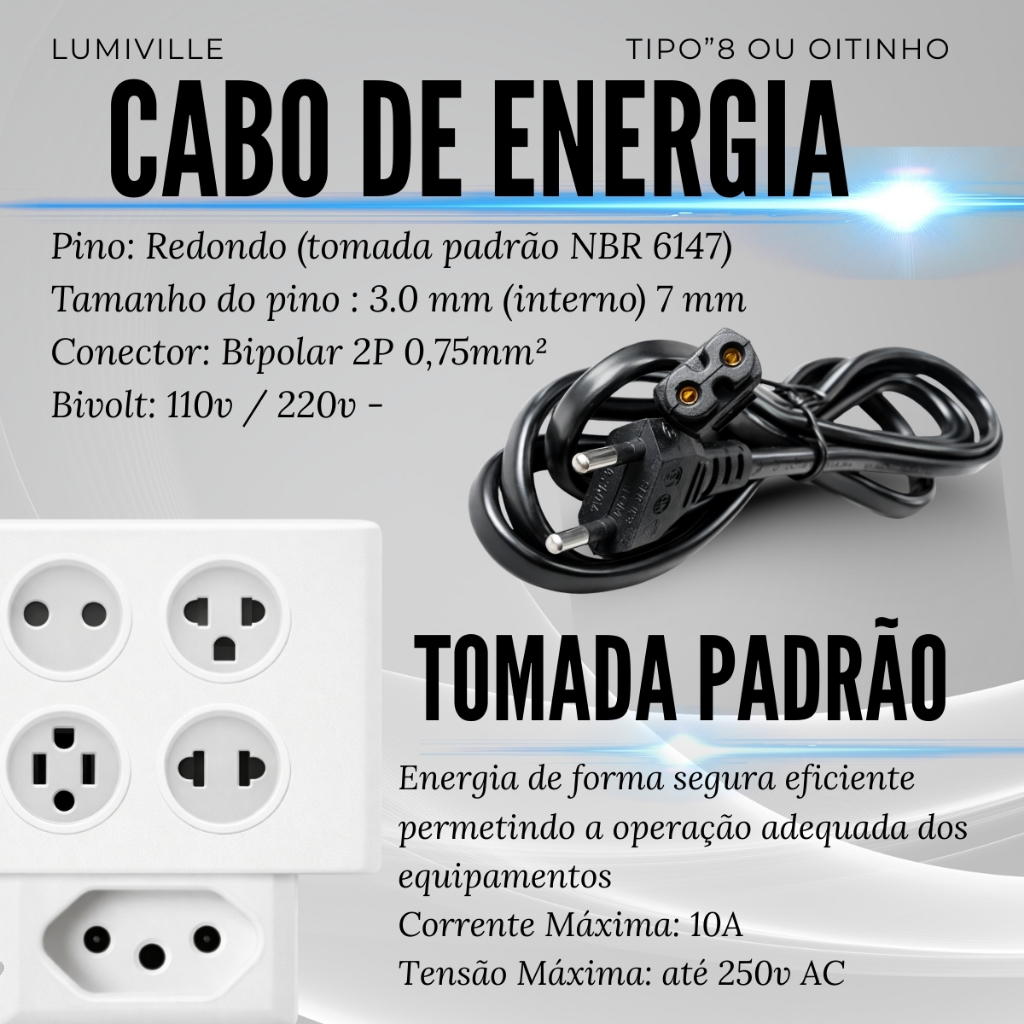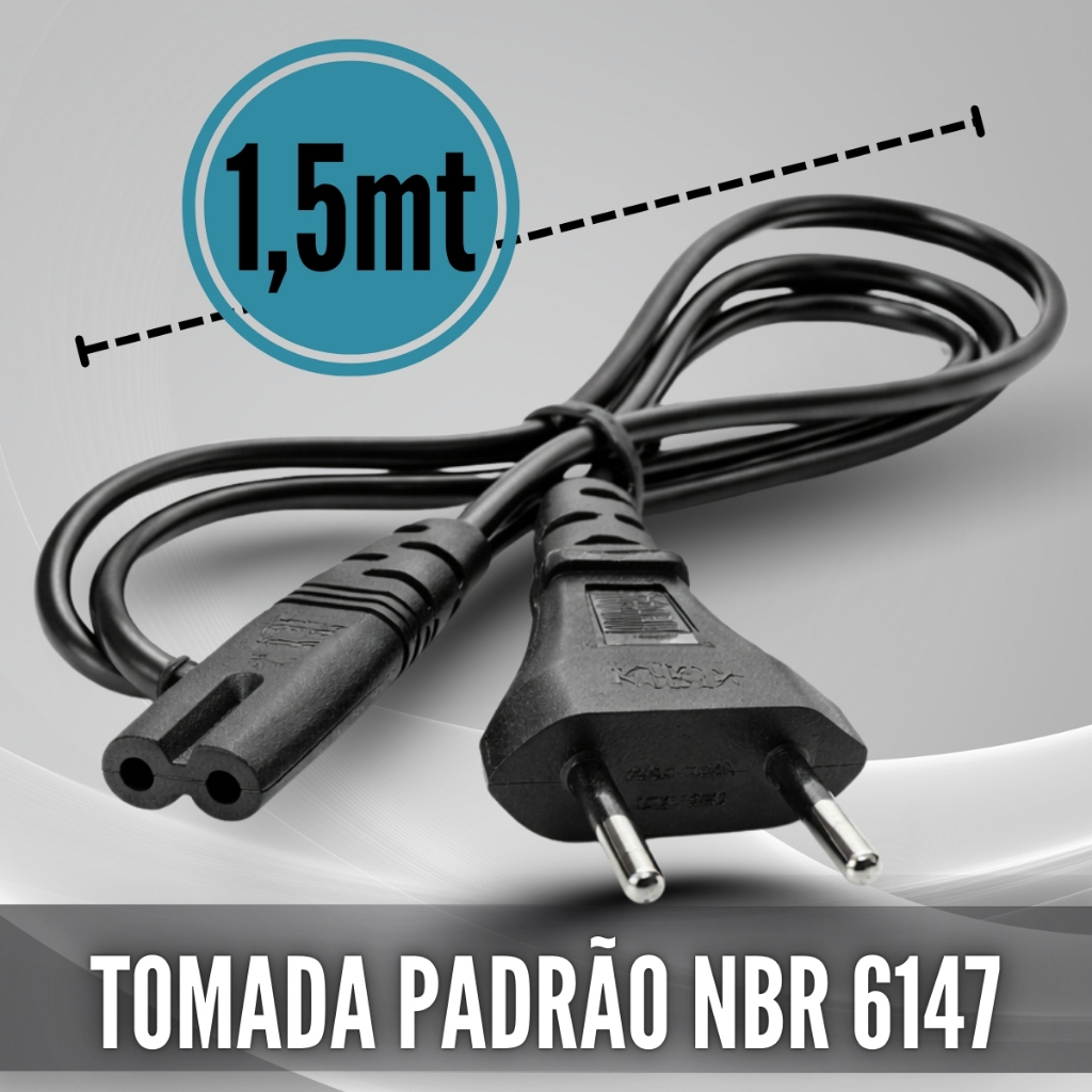 Cabo de força Bipolar Padrão (8) 10A 1,5mt para Rádio, TV, Vídeo Game, PS2, Som 2 Pinos Universal