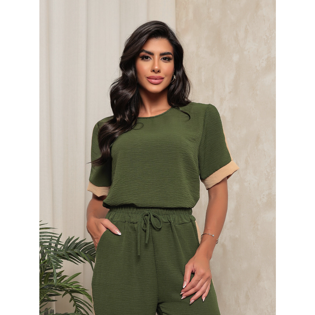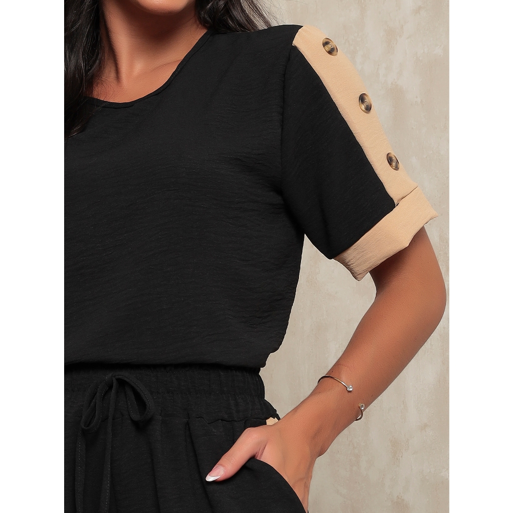 T045 conjunto calça e blusa com detalhe com botao nas mangas