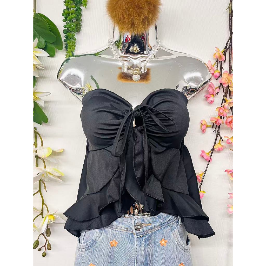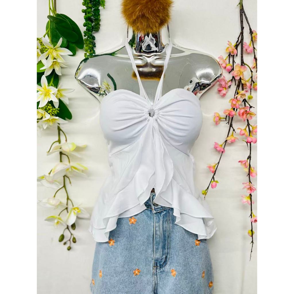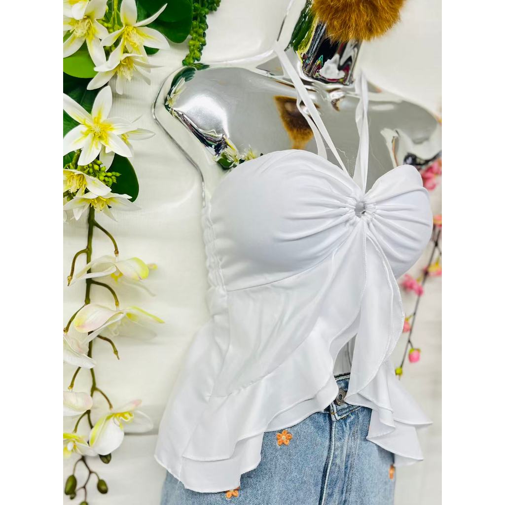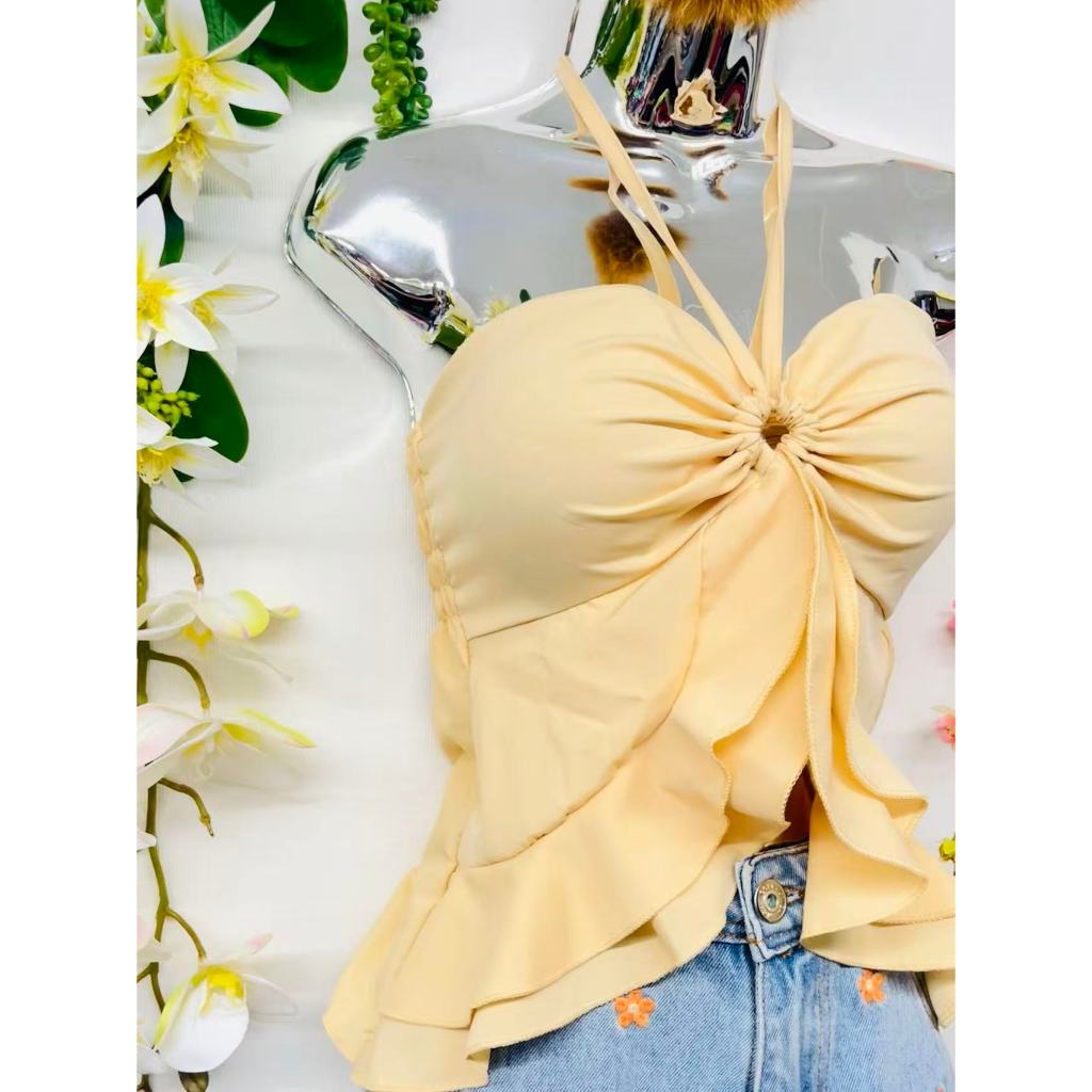 T106Blusinha Cropped Borboleta Feminina Amarracao Pescoco Elegante