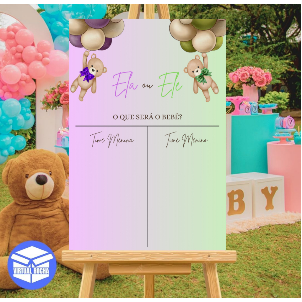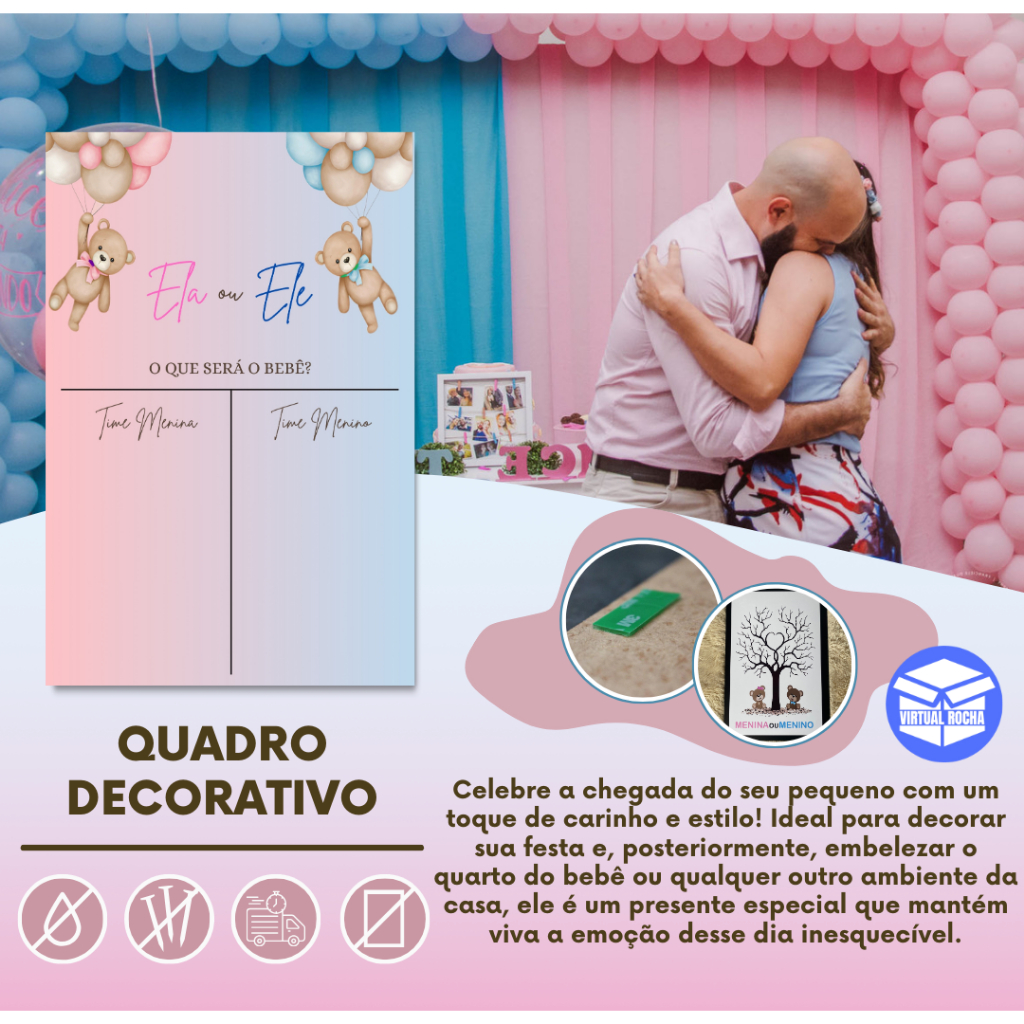 Quadro Decorativo Chá Revelação Rosa e Azul Ursos Ele ou Ela