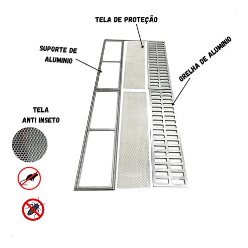 Ralo Grelha 15x100 Alumínio com Aro e Tela Antinseto para Quintal Varanda Piscina Sauna Corredor Jardim Banheiro