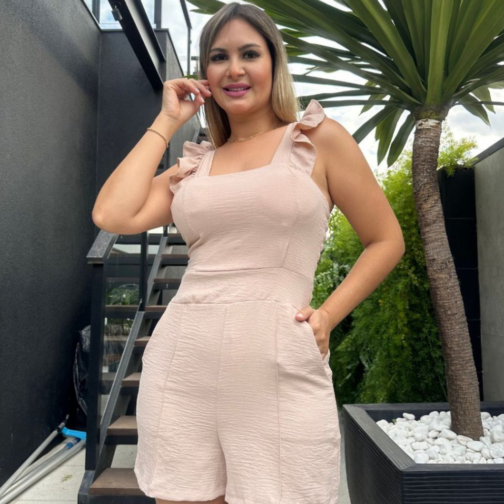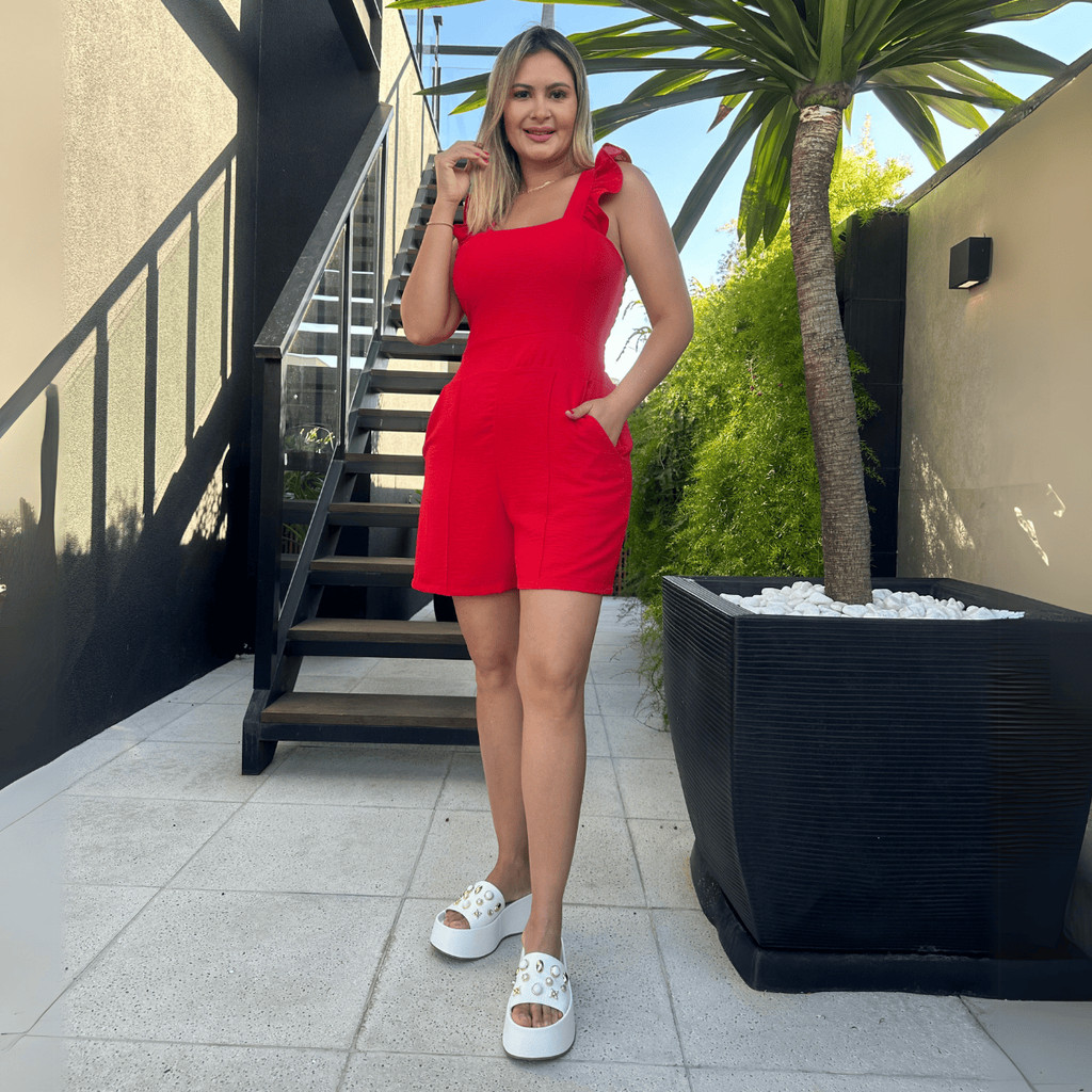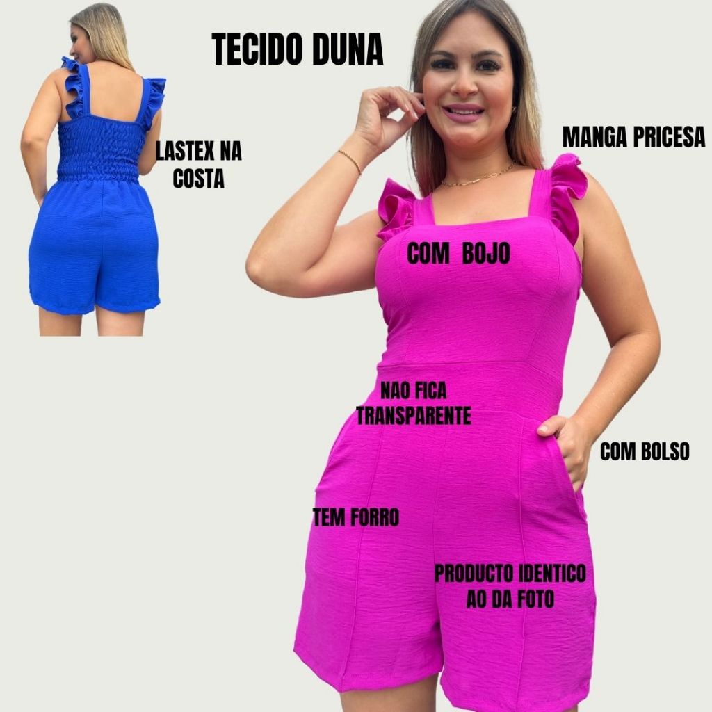 Macaquinho Feminino Macacão Curto Forrado Casual Duna Verão Com Bolso Manga Babado Liso Promoção