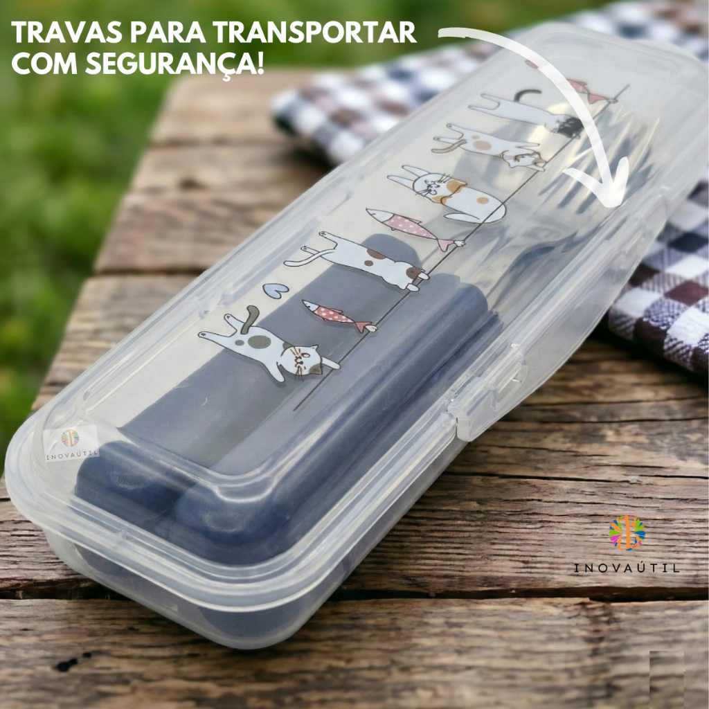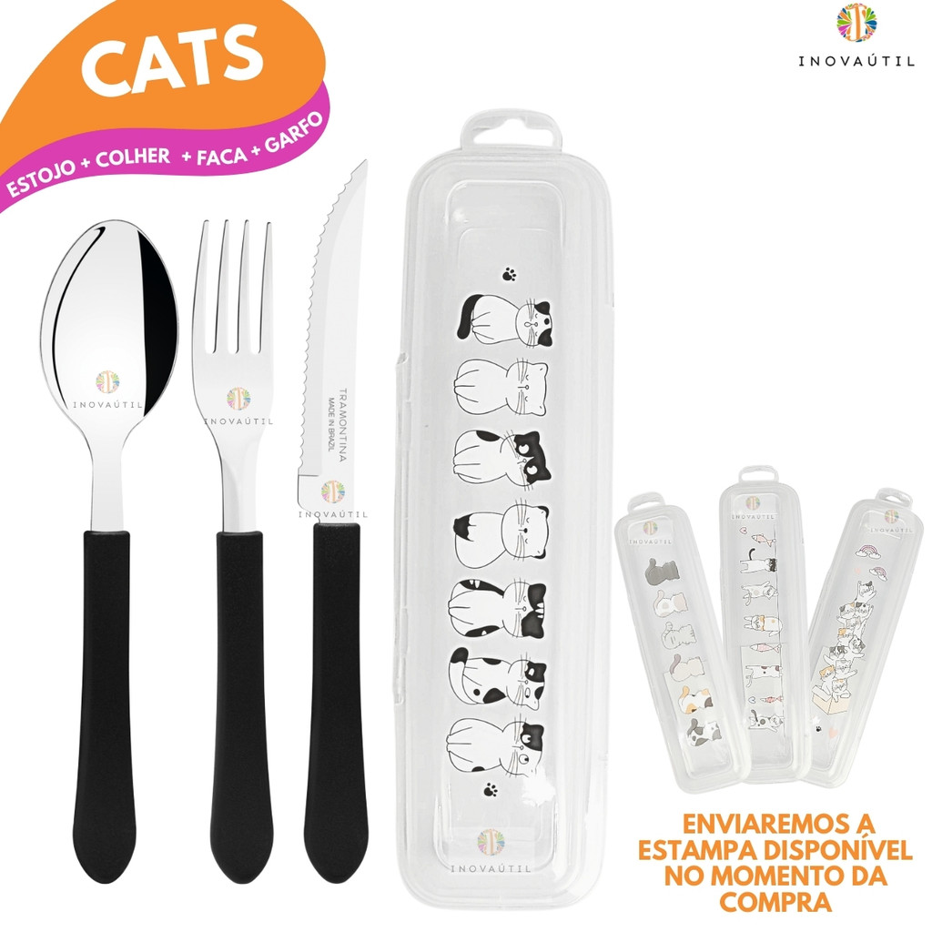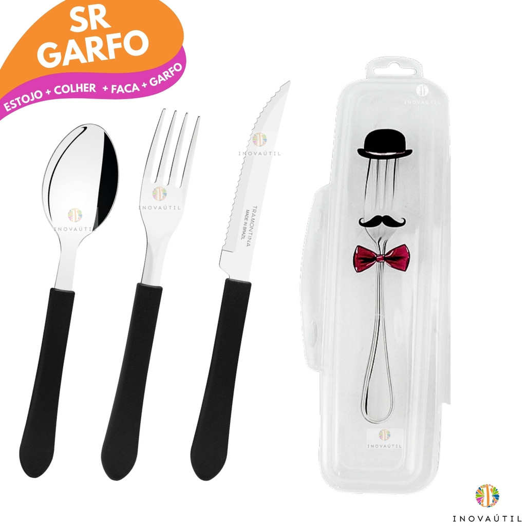 Porta Talher Estojo Decorado Viagem Com Garfo Faca e Colher Tramontina Inox Cabo Preto