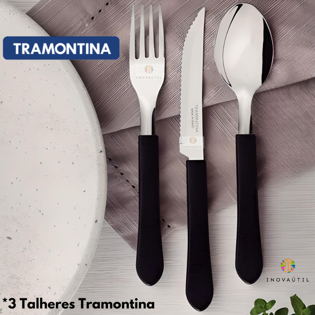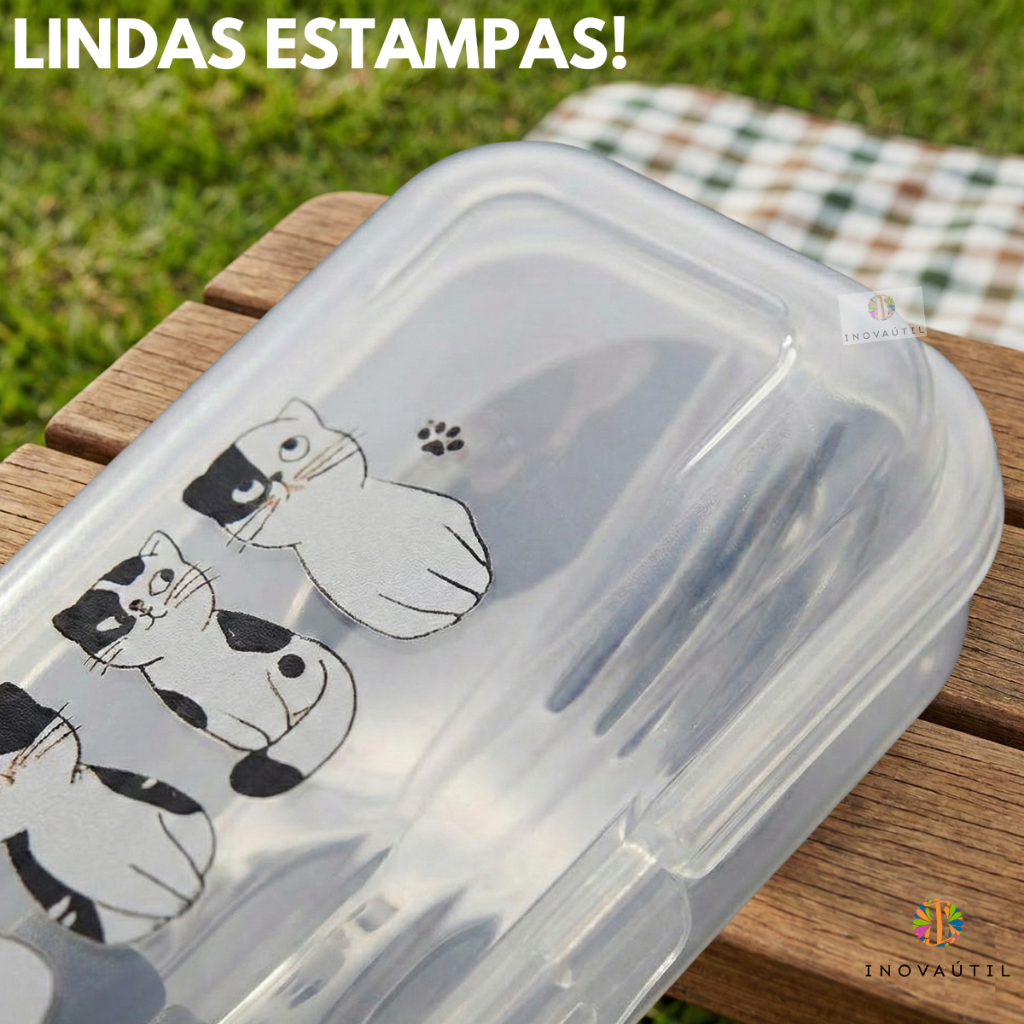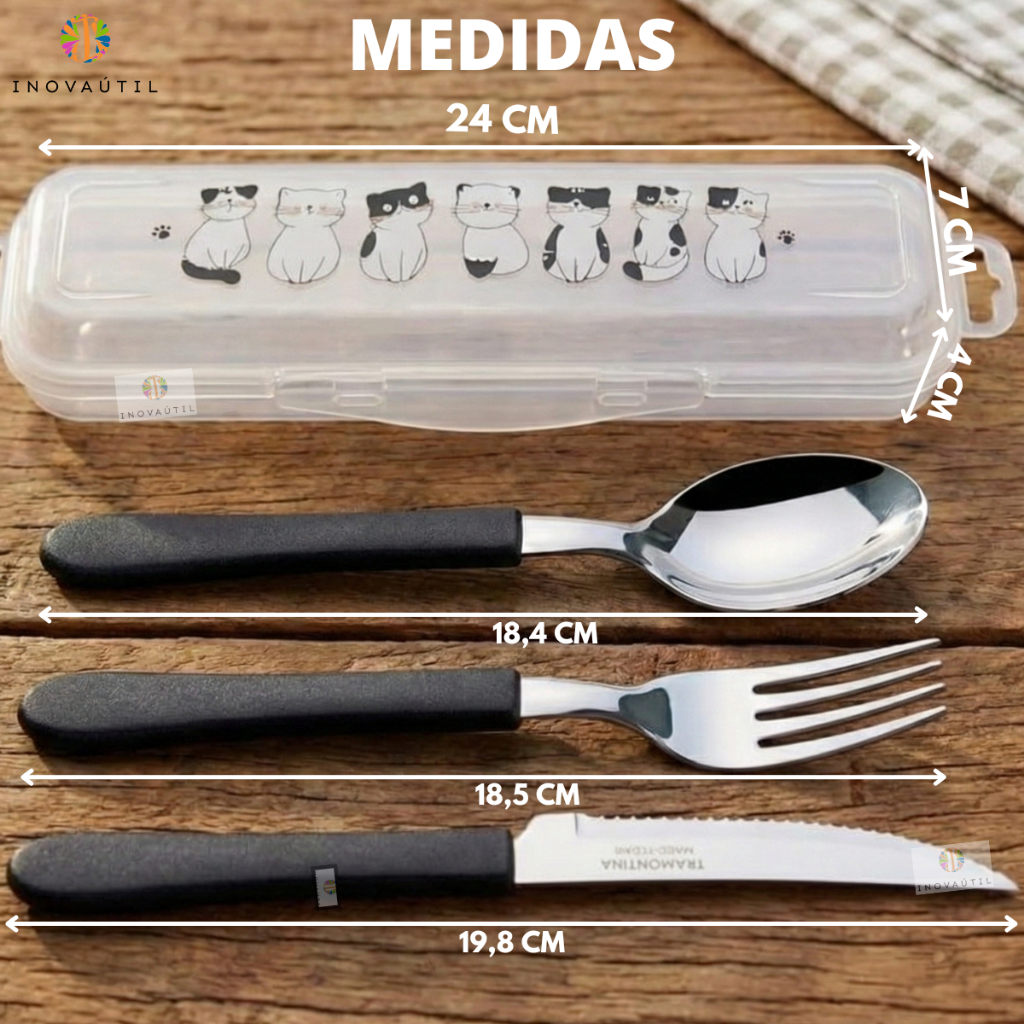 Porta Talher Estojo Decorado Viagem Com Garfo Faca e Colher Tramontina Inox Cabo Preto