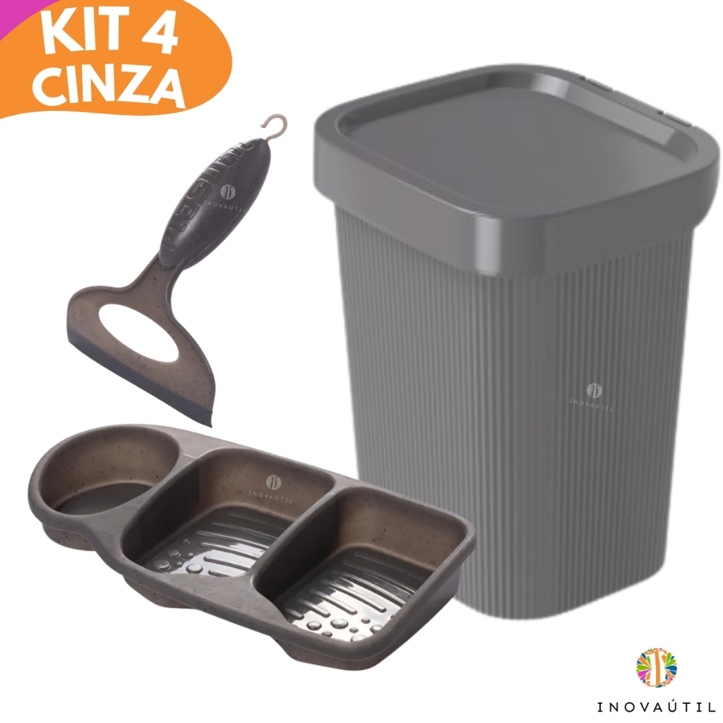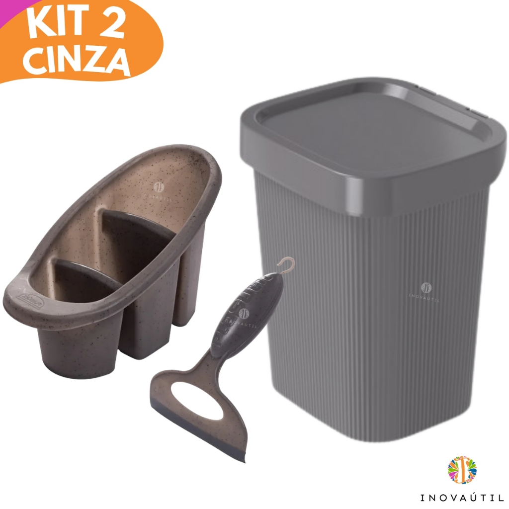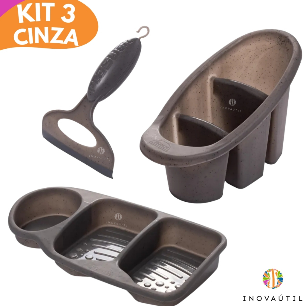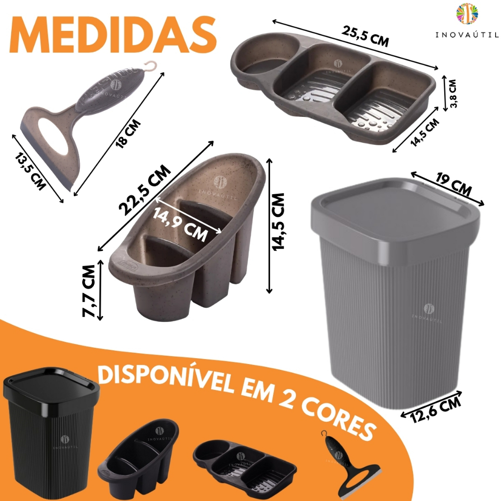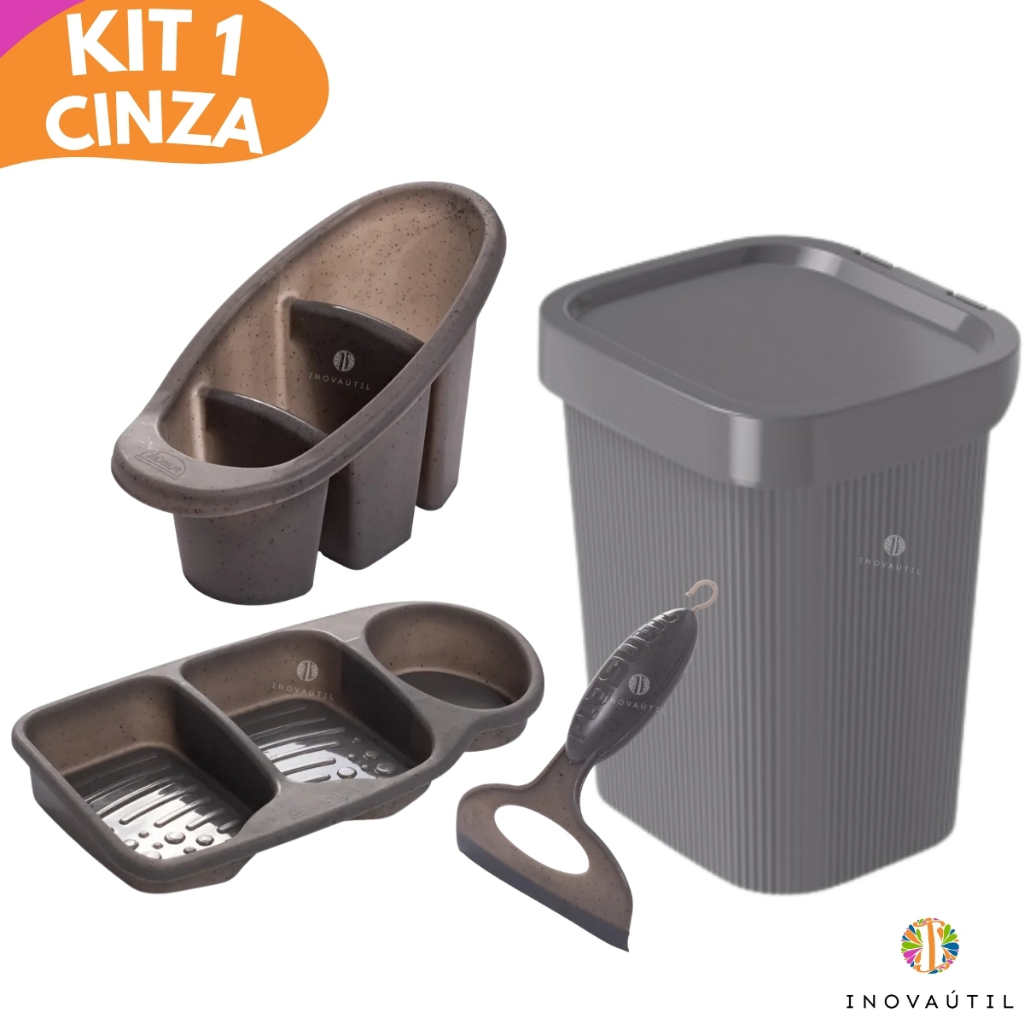 Kit Pia Cozinha Lixeira Friso, Porta Talher Escorredor, Porta Detergente 3em1 e Rodinho