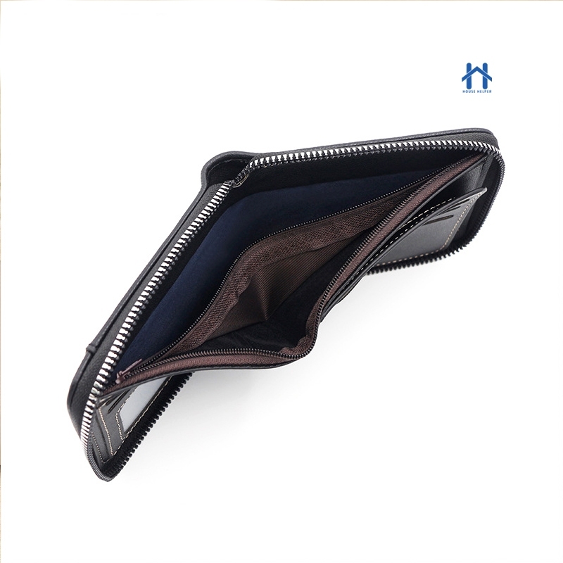 Carteira Masculina de Couro com Zíper Porta Documentos e Cartão com Visor Transparente