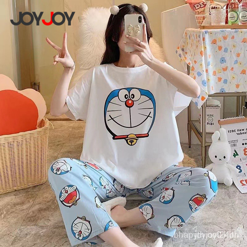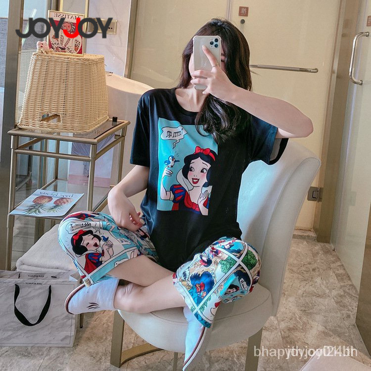 Joyjoy Pijama Feminino Cartoon–Verão Casual com Manga Curta e Calça Xadrez Confortável, Conjunto de Roupas de Sala Fofo