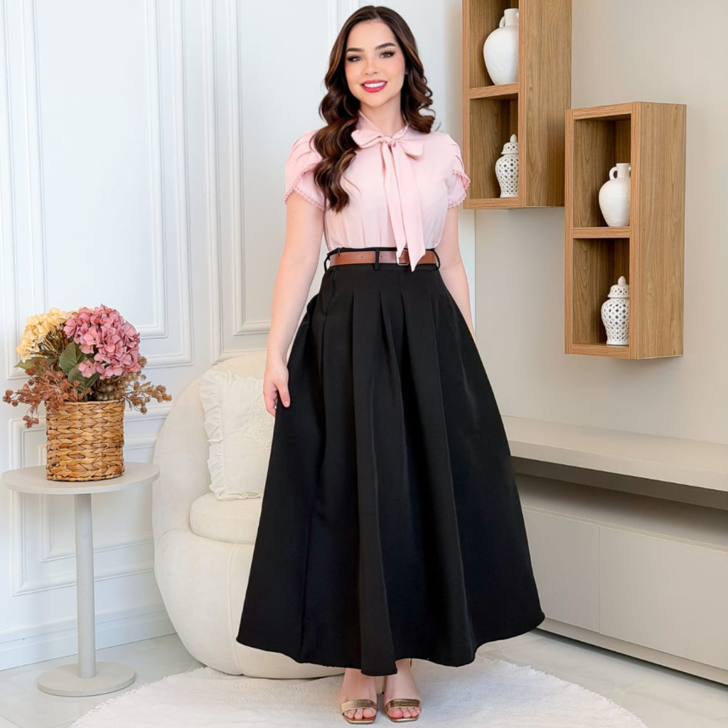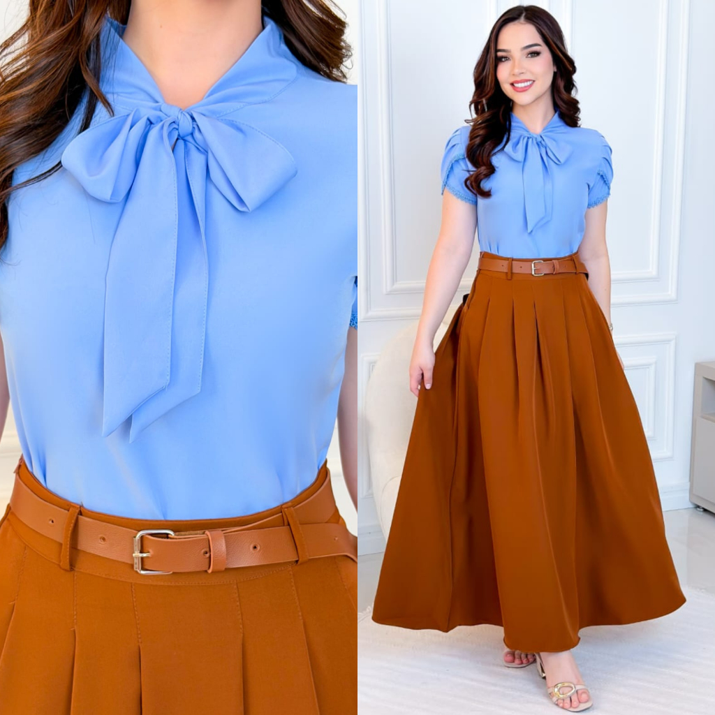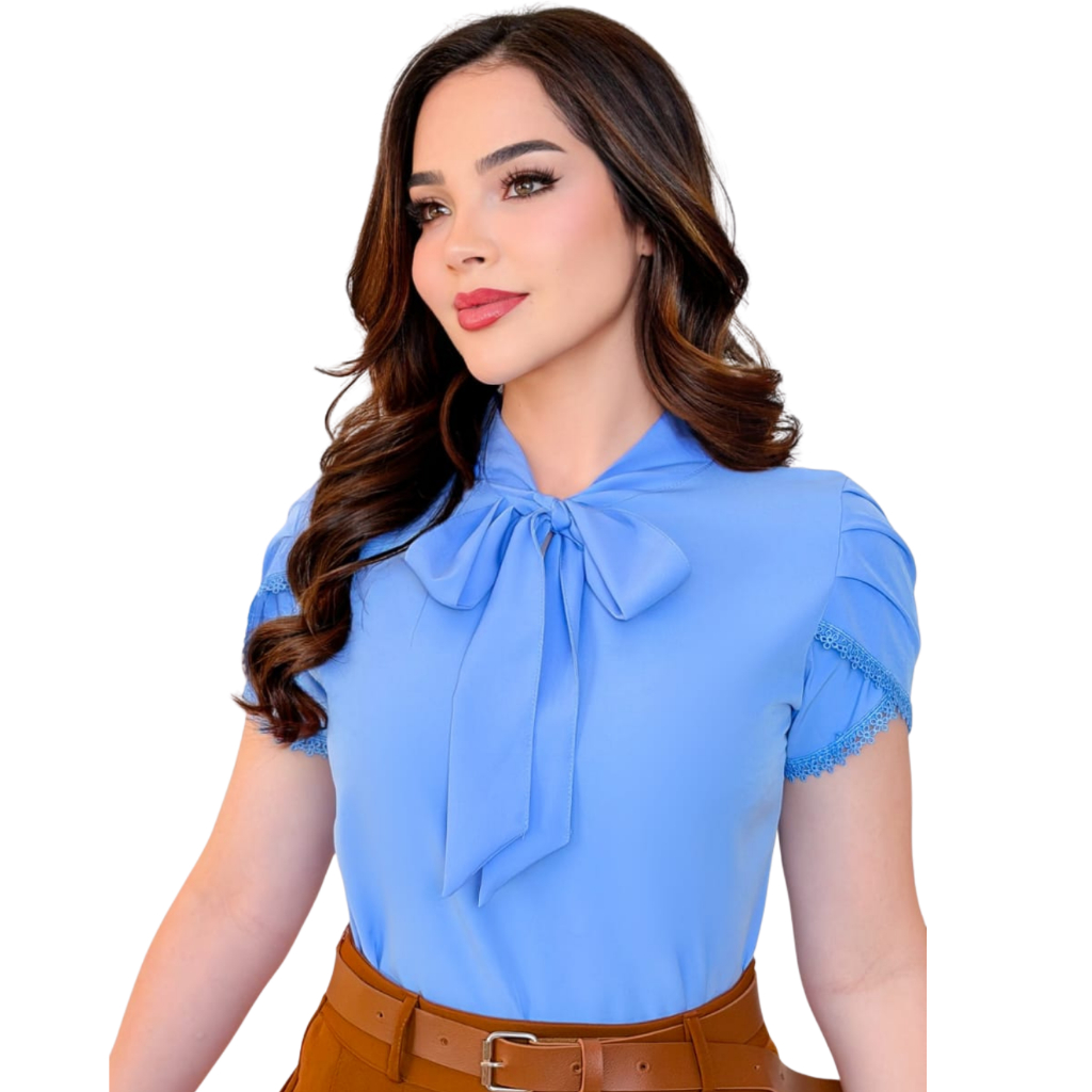 Blusa Feminina Social Chic com Laço Moda Evangélica Delicada Moderna Crepinho Renda Manga Curta