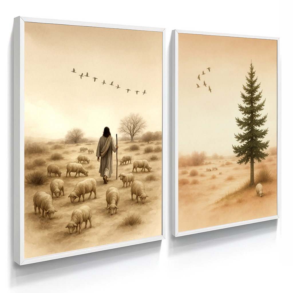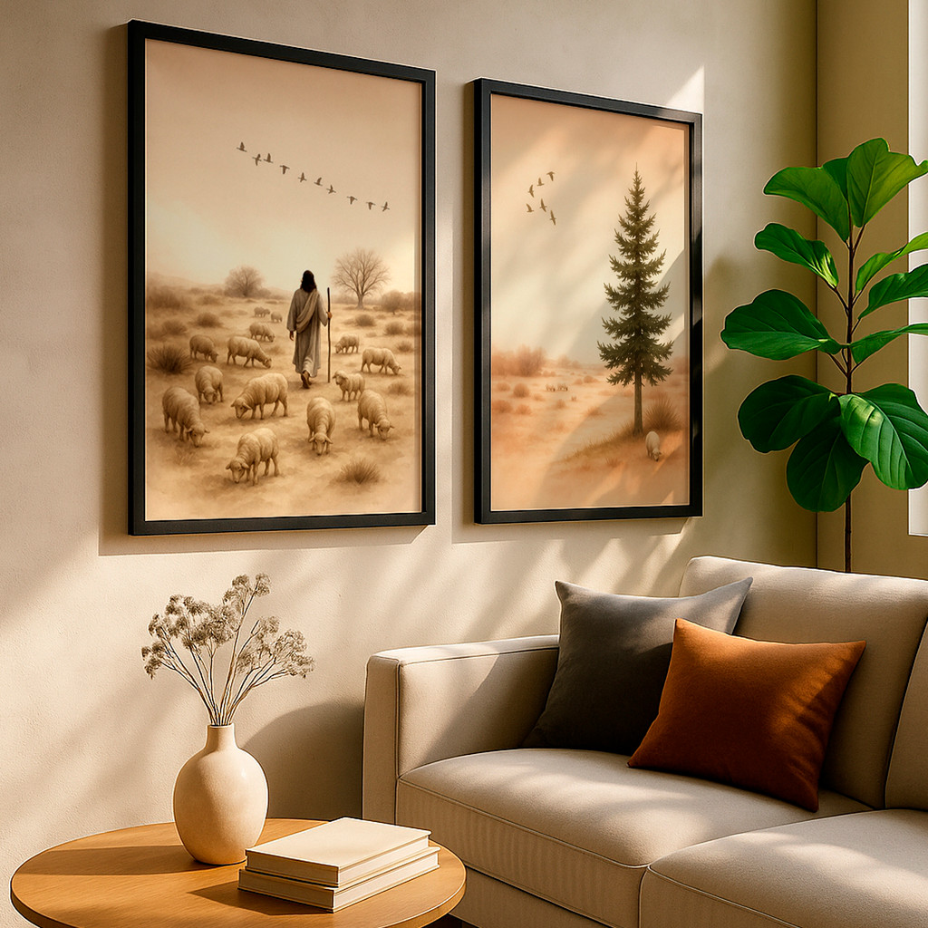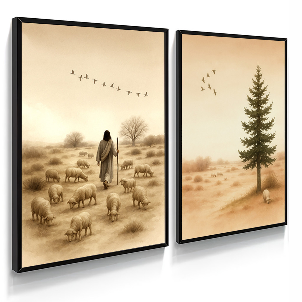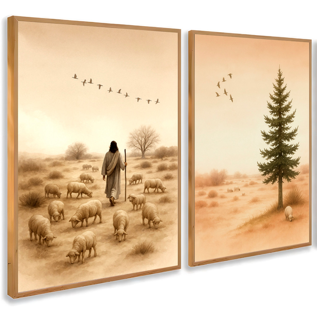 Kit 2 Quadros Pastor e Ovelhas Paisagem Cristã Religiosa Tons Quentes Fé e Esperança Com Moldura