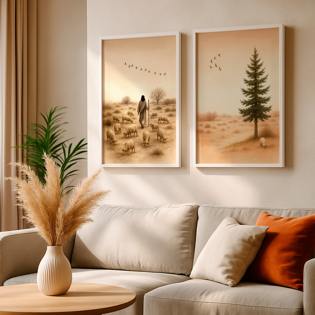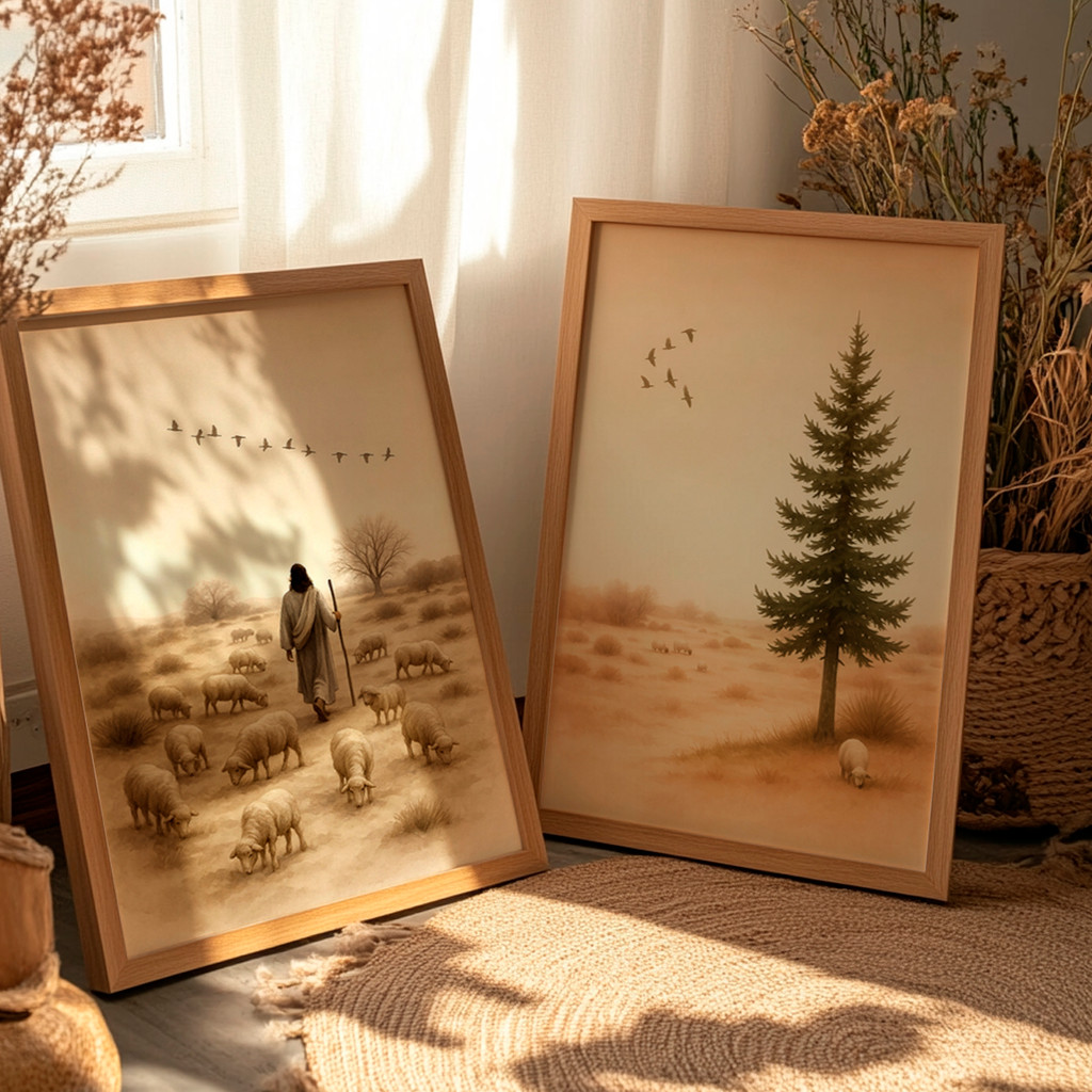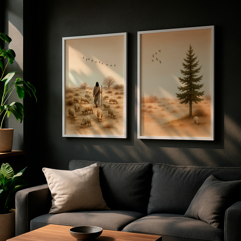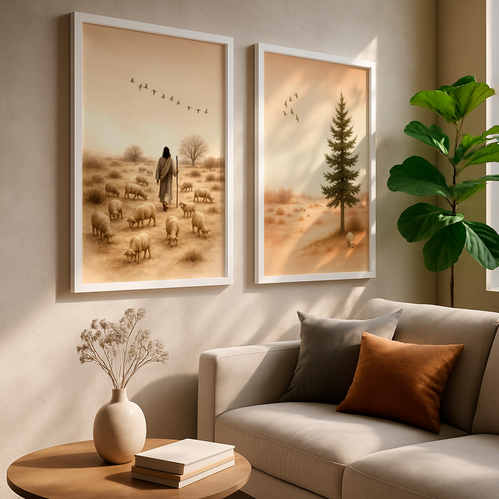Kit 2 Quadros Pastor e Ovelhas Paisagem Cristã Religiosa Tons Quentes Fé e Esperança Com Moldura