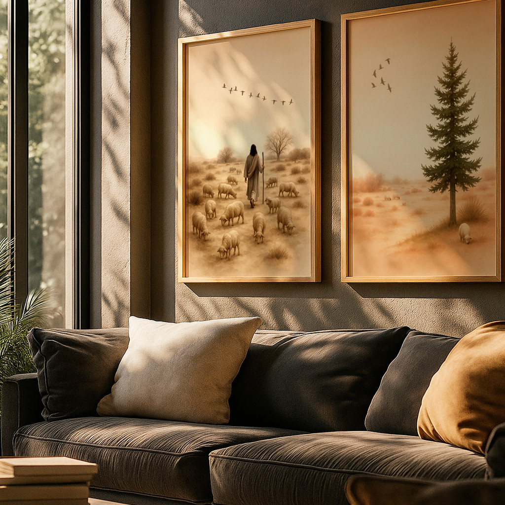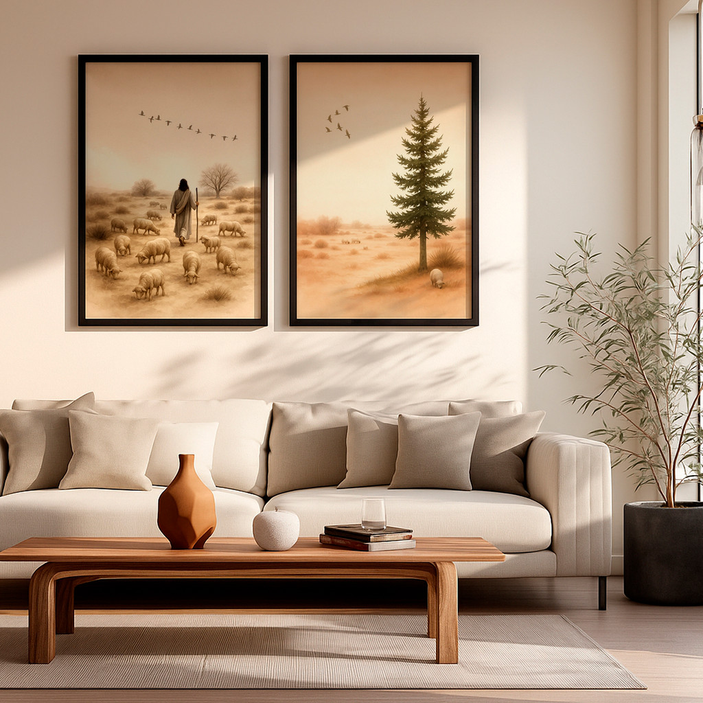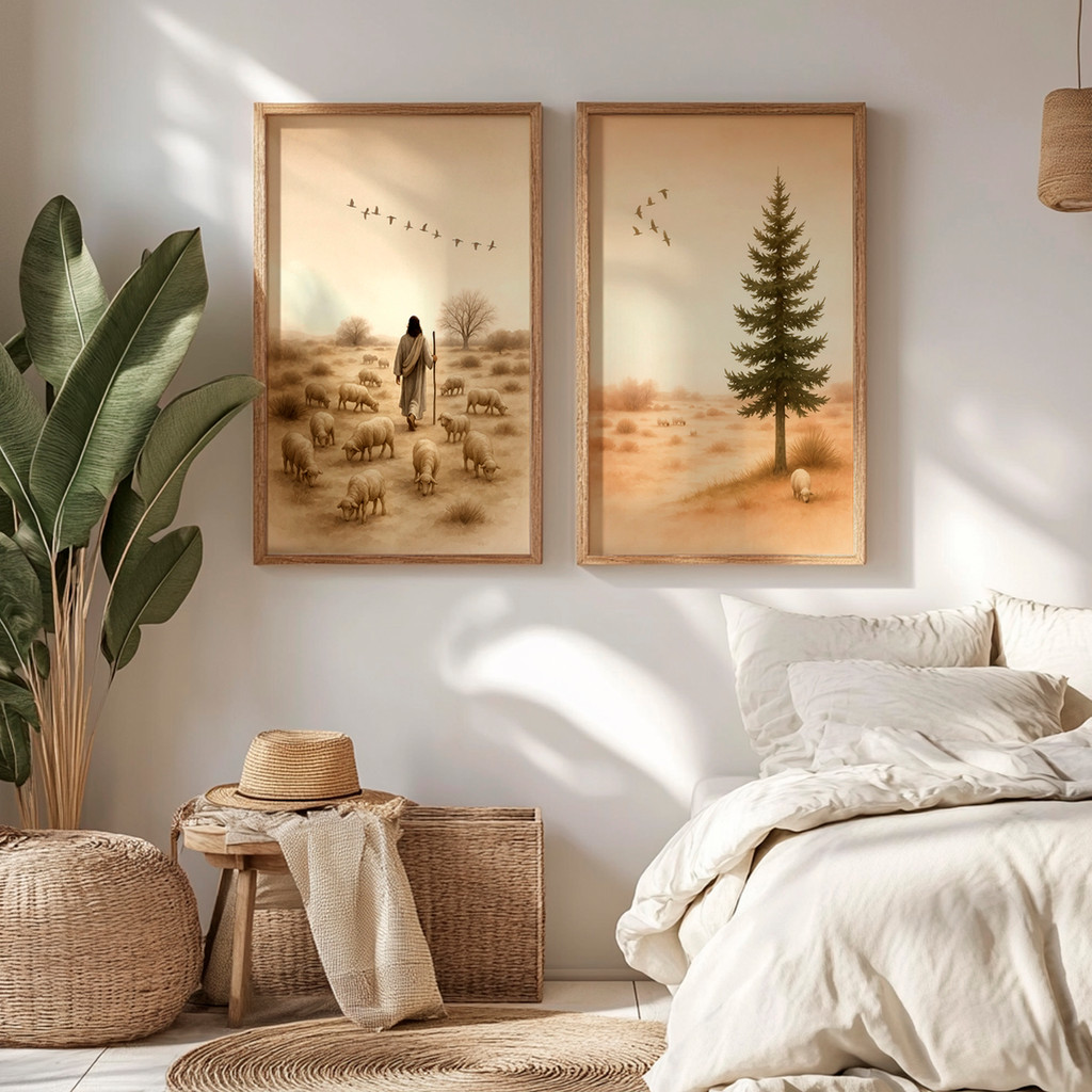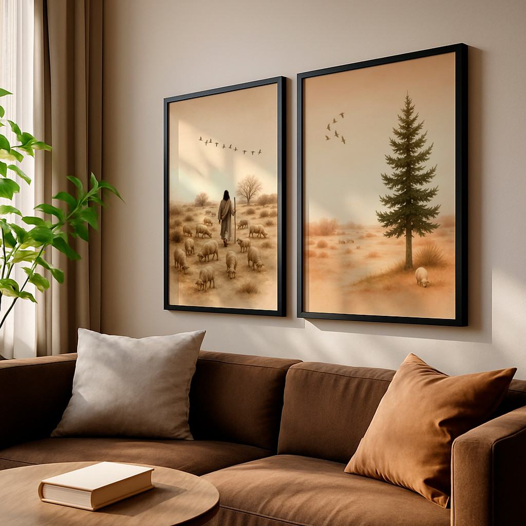 Kit 2 Quadros Pastor e Ovelhas Paisagem Cristã Religiosa Tons Quentes Fé e Esperança Com Moldura
