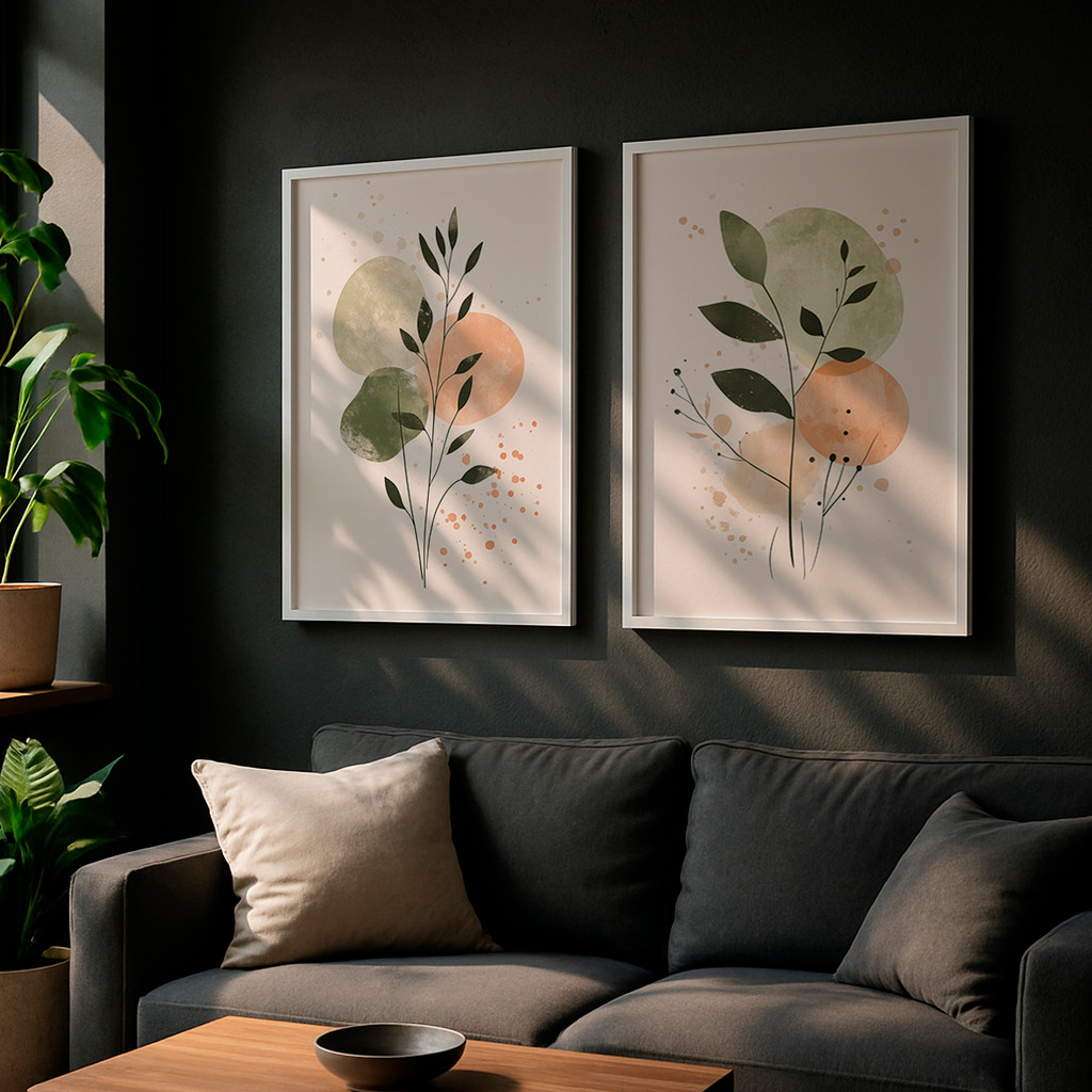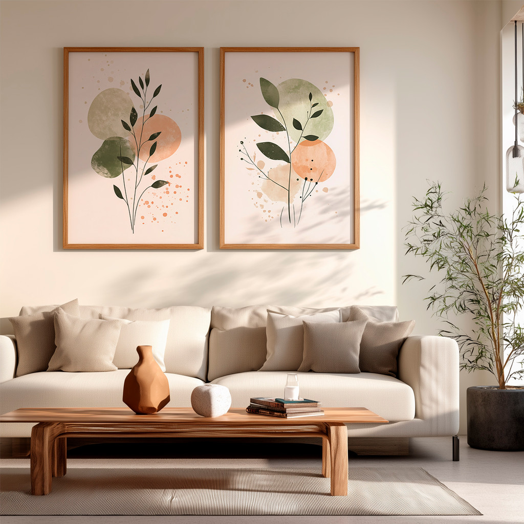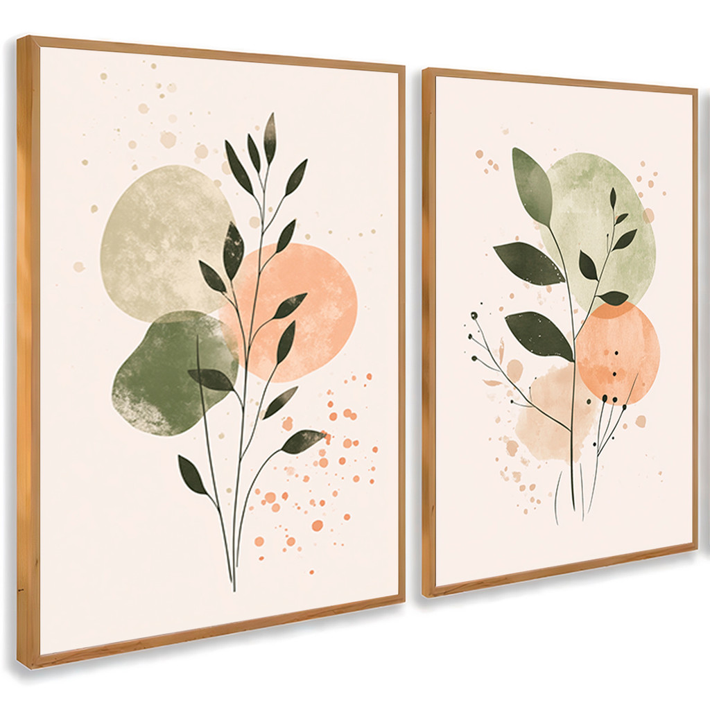 Kit 2 Quadros Com Moldura Decorativo Ramo Verde Folhas Abstratas Coloridas Delicado Neutro