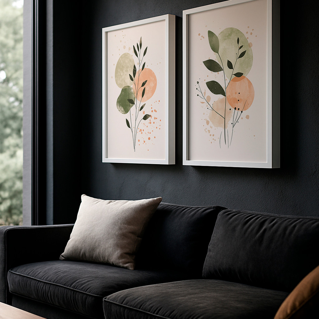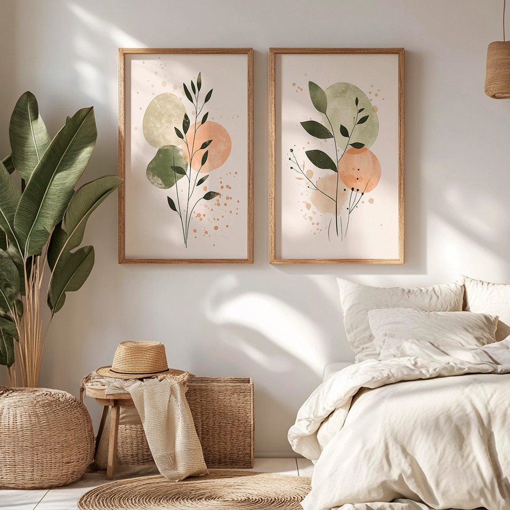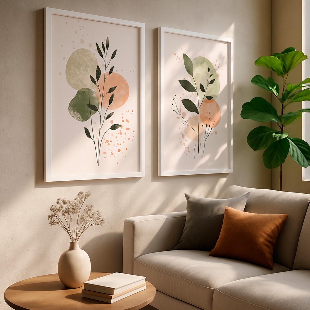 Kit 2 Quadros Com Moldura Decorativo Ramo Verde Folhas Abstratas Coloridas Delicado Neutro