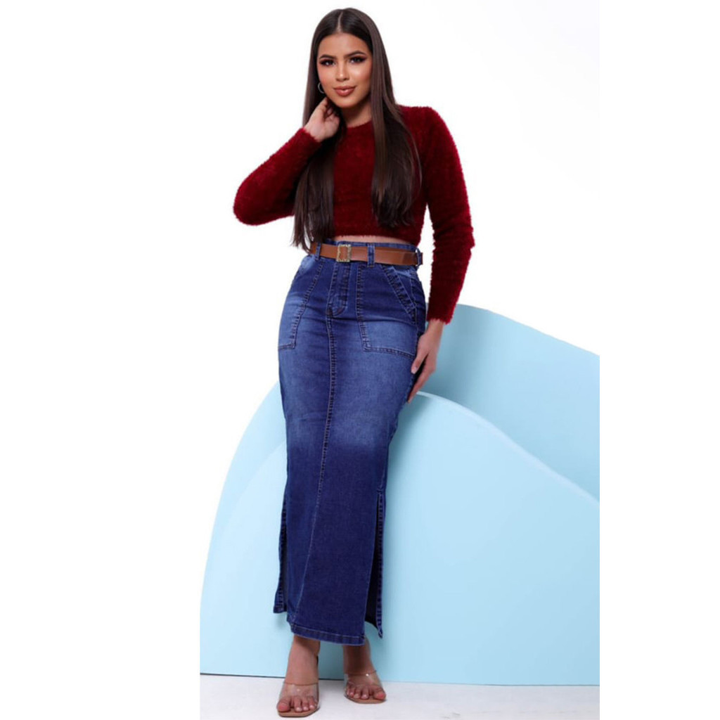 Saia Jeans Longa Com Lycra Com Bolsos Moda Evangélica Saia Jeans Mide Evangélica