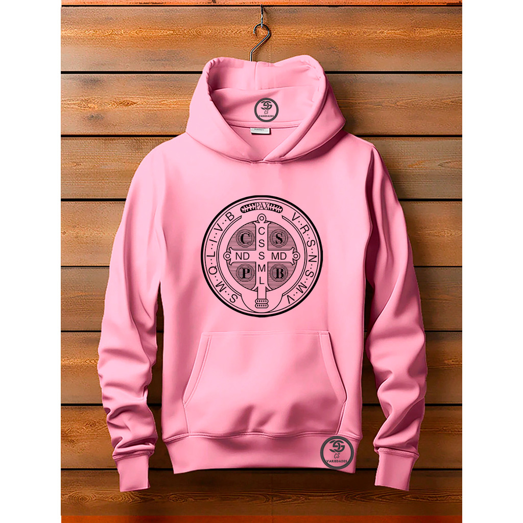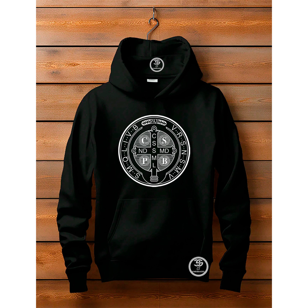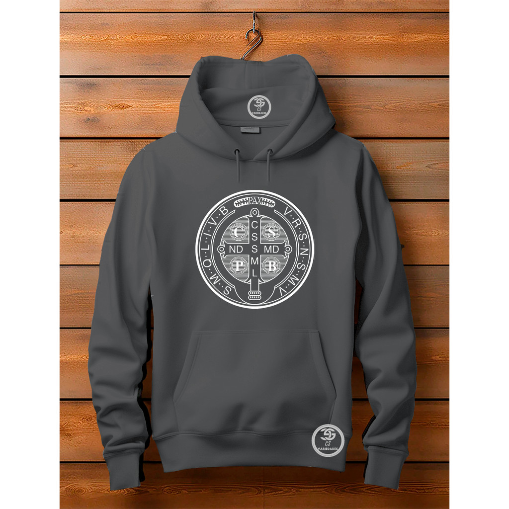 Moletom unissex Canguru Linha Premium Medalha de São Bento Blusa Feminina Com bolso e capuz Estampa Moda Cristã