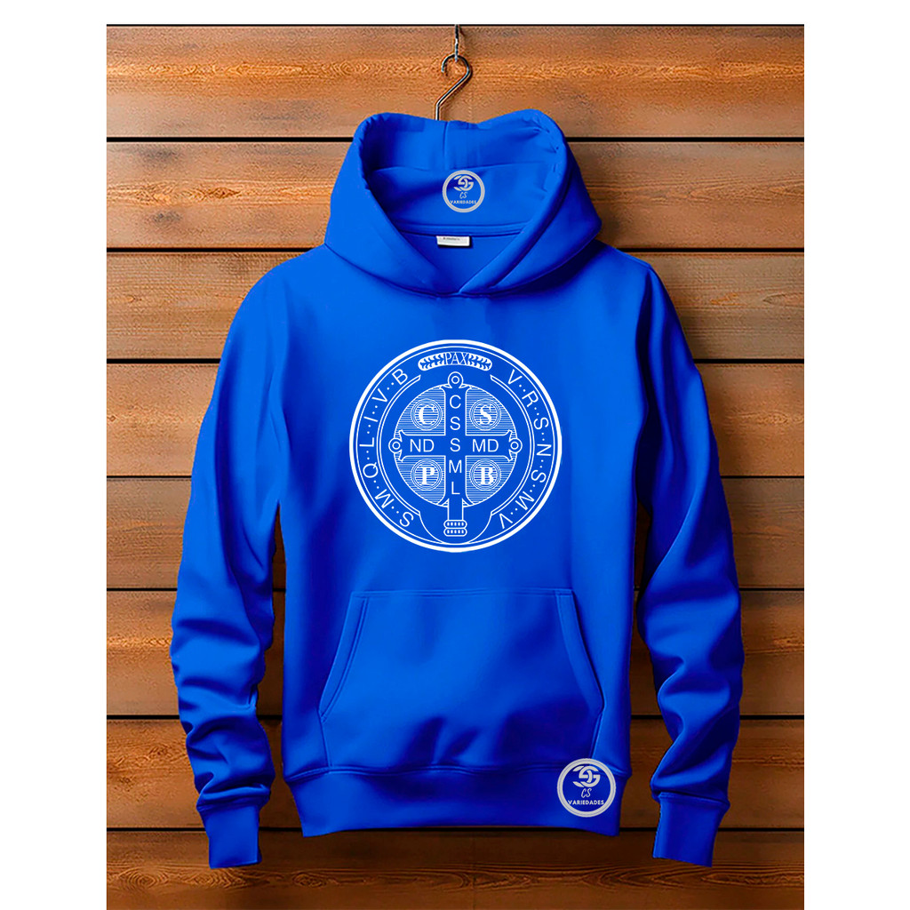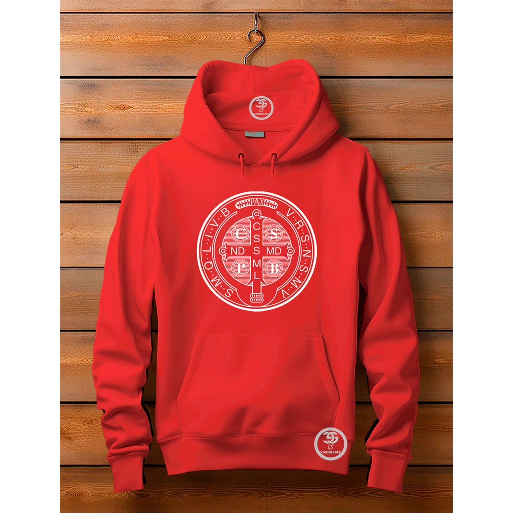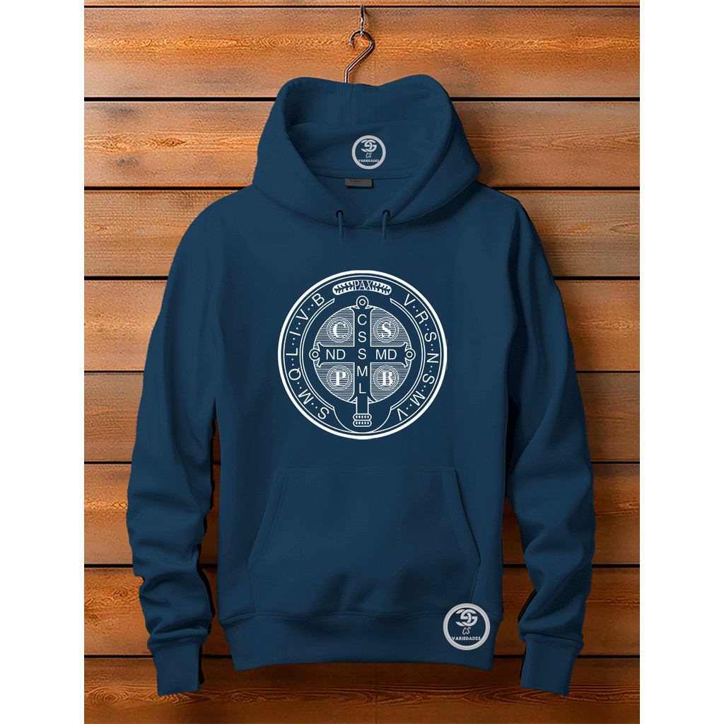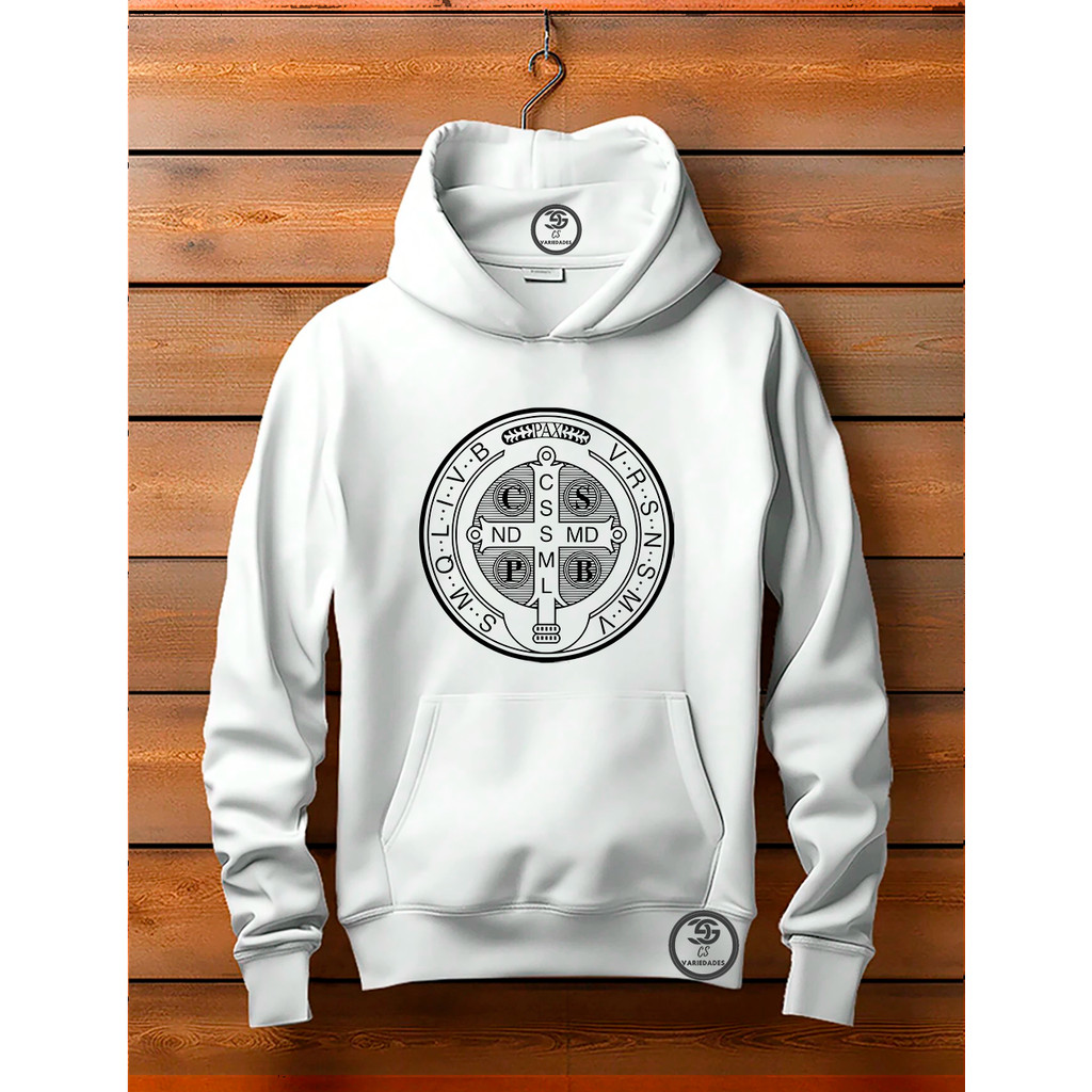 Moletom unissex Canguru Linha Premium Medalha de São Bento Blusa Feminina Com bolso e capuz Estampa Moda Cristã