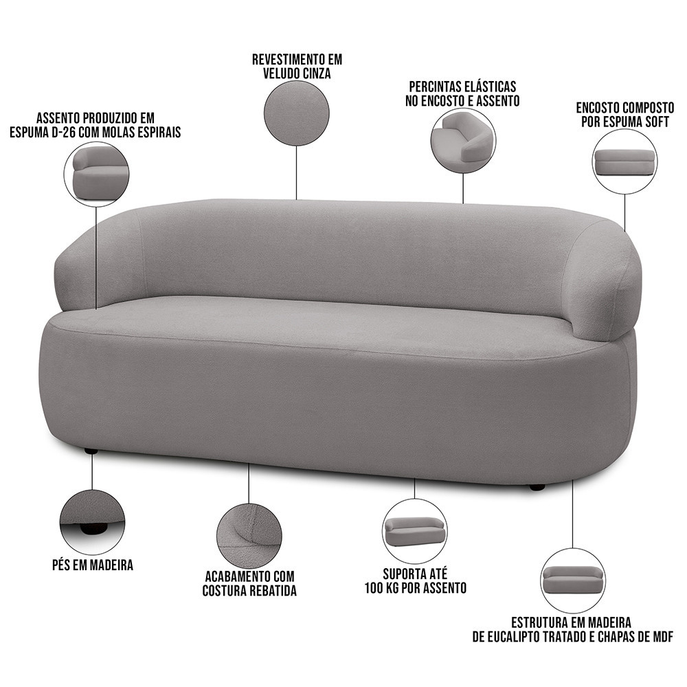 Sofá 2 Lugares Orgânico Sala de Estar Living 140cm Carmen F04 Veludo Cinza - Lyam Decor