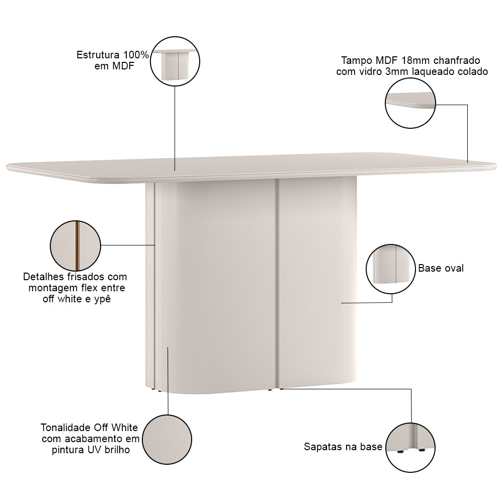Mesa de Jantar 6 Lugares Retangular Tampo Vidro Verbena N01 Off White - Lyam Decor