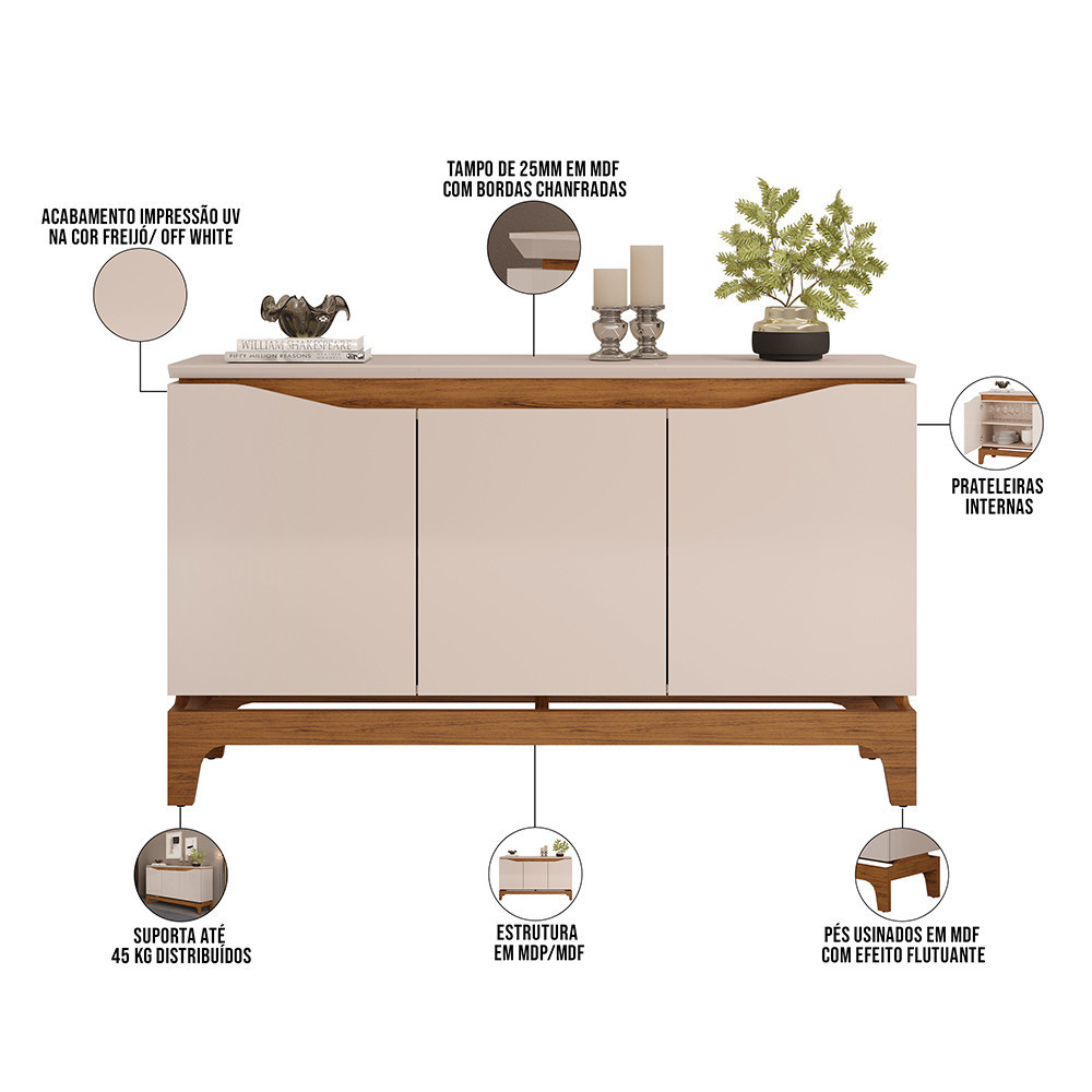 Aparador Buffet Para Sala de Jantar 3 Portas 139cm Clarice D05 Freijó Off White - Lyam Decor