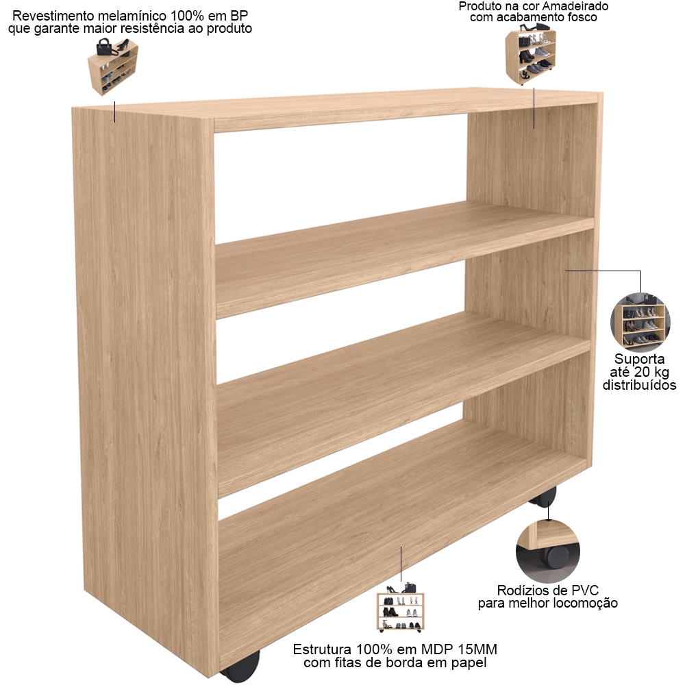 Sapateira Multiuso Organizador Com 03 Prateleiras E Rodizio Pérola L03 Amadeirado - Lyam