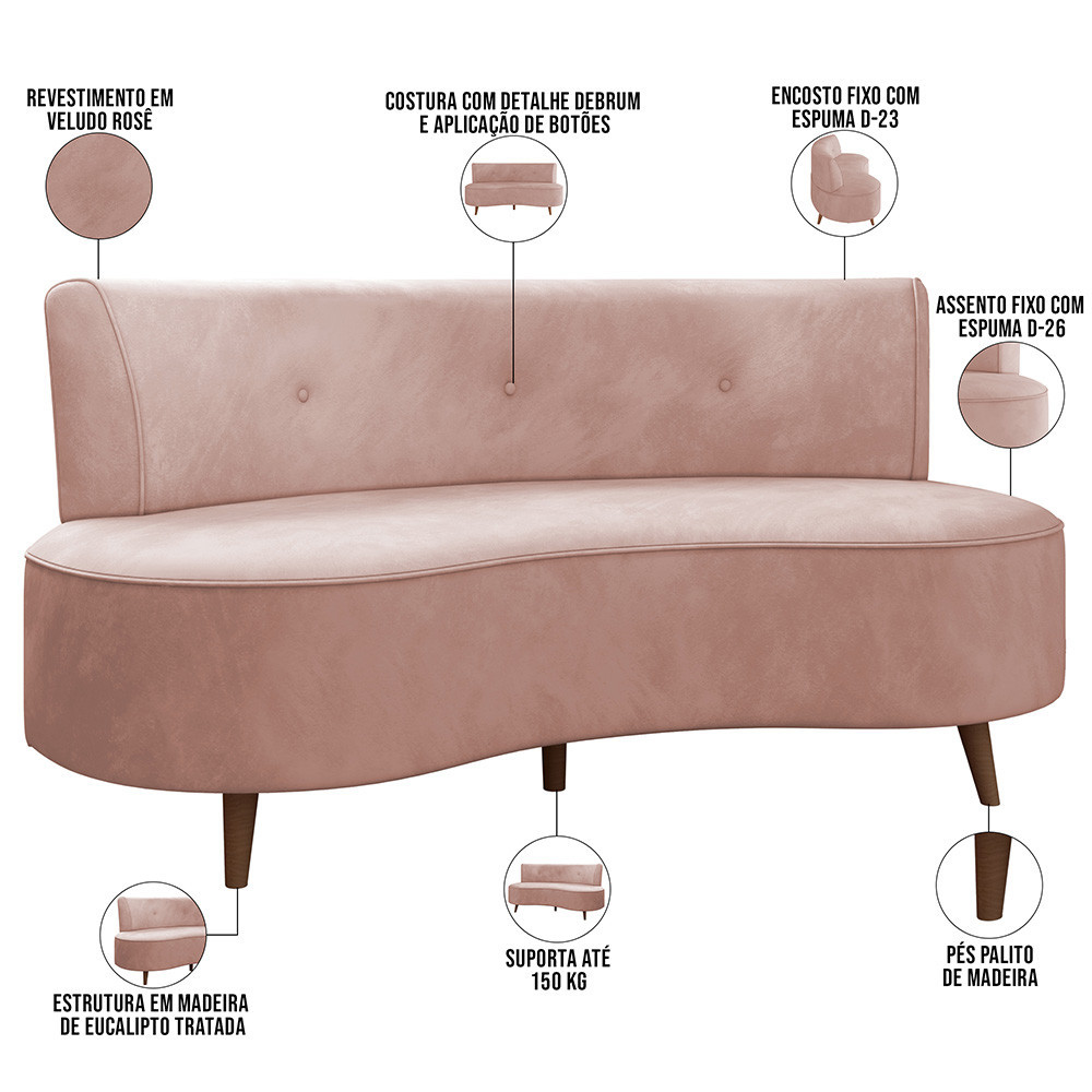 Sofá Chaise Living 2 Lugares 135cm Sala de Estar Istambul K01 Veludo Rosê - Lyam Decor