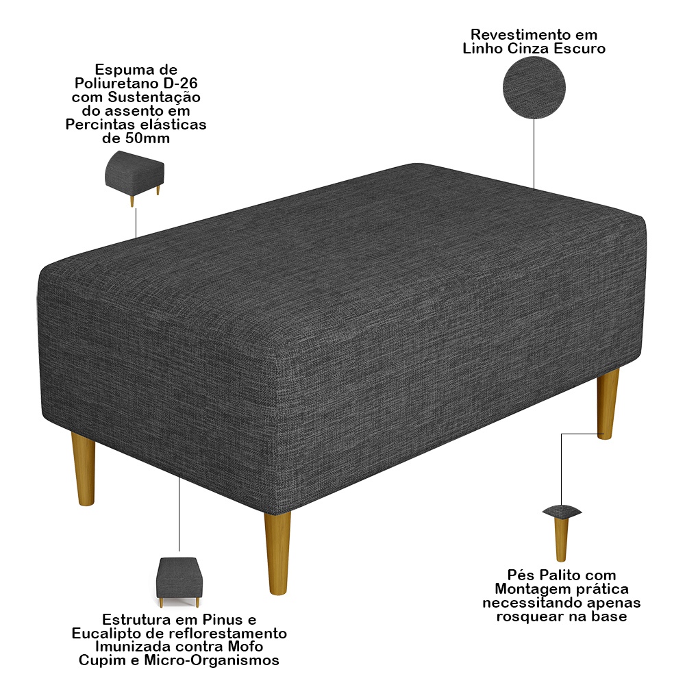 Puff Decorativo Sala de Estar Cléo W01 Pés Palito 90 cm Linho Cinza Escuro - Lyam Decor