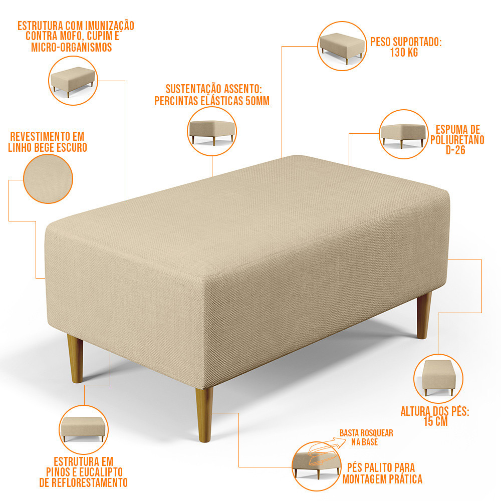 Puff Decorativo Sala de Estar Cléo W01 Pés Palito 90 cm Linho Bege Escuro - Lyam Decor