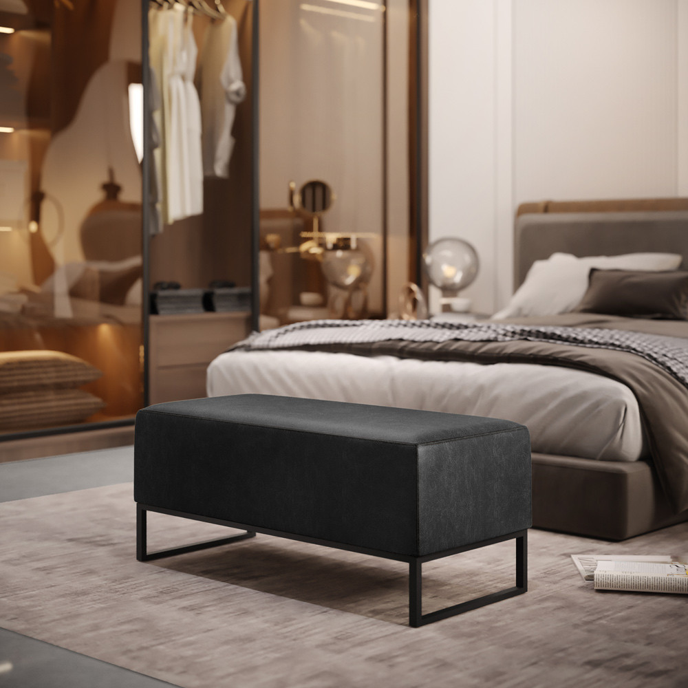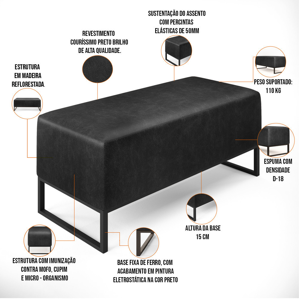 Puff Decorativo Para Sala de Estar Cléo W01 Base de Ferro 90 cm Couríssimo Preto Brilho - Lyam Decor