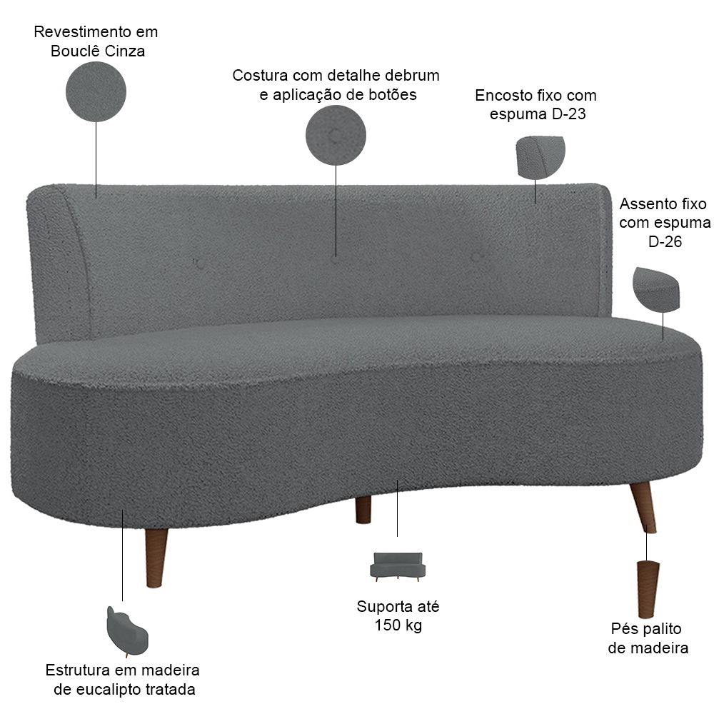 Sofá Chaise Living 2 Lugares 160cm para Sala Istambul K01 Bouclê Cinza - Lyam Decor