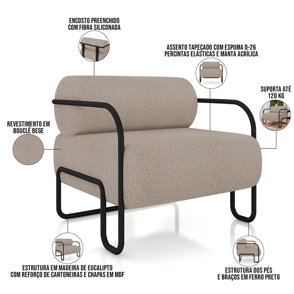 Poltrona Decorativa Pés Industrial Moscou K01 Bouclê Bege - Lyam Decor