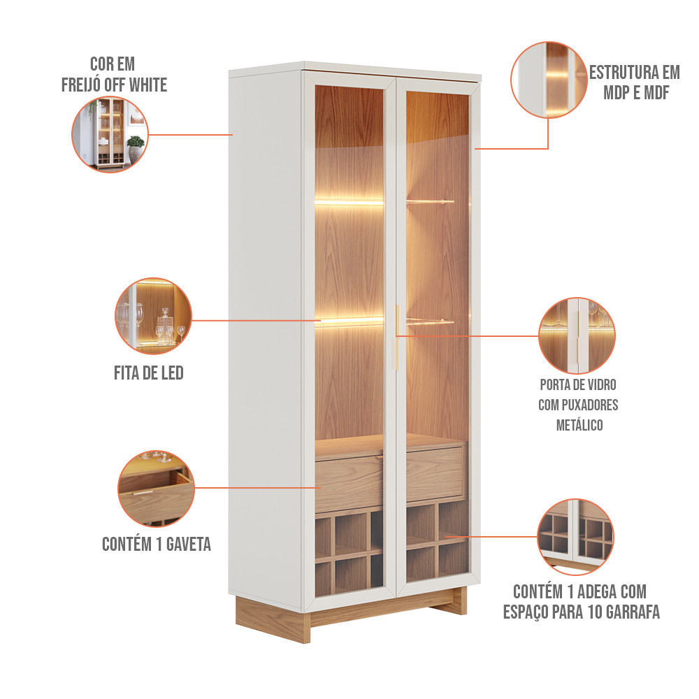 Kit Para Sala de Jantar Buffet Áustria C04 com Cristaleira Malibu Freijó Off White - Lyam Decor