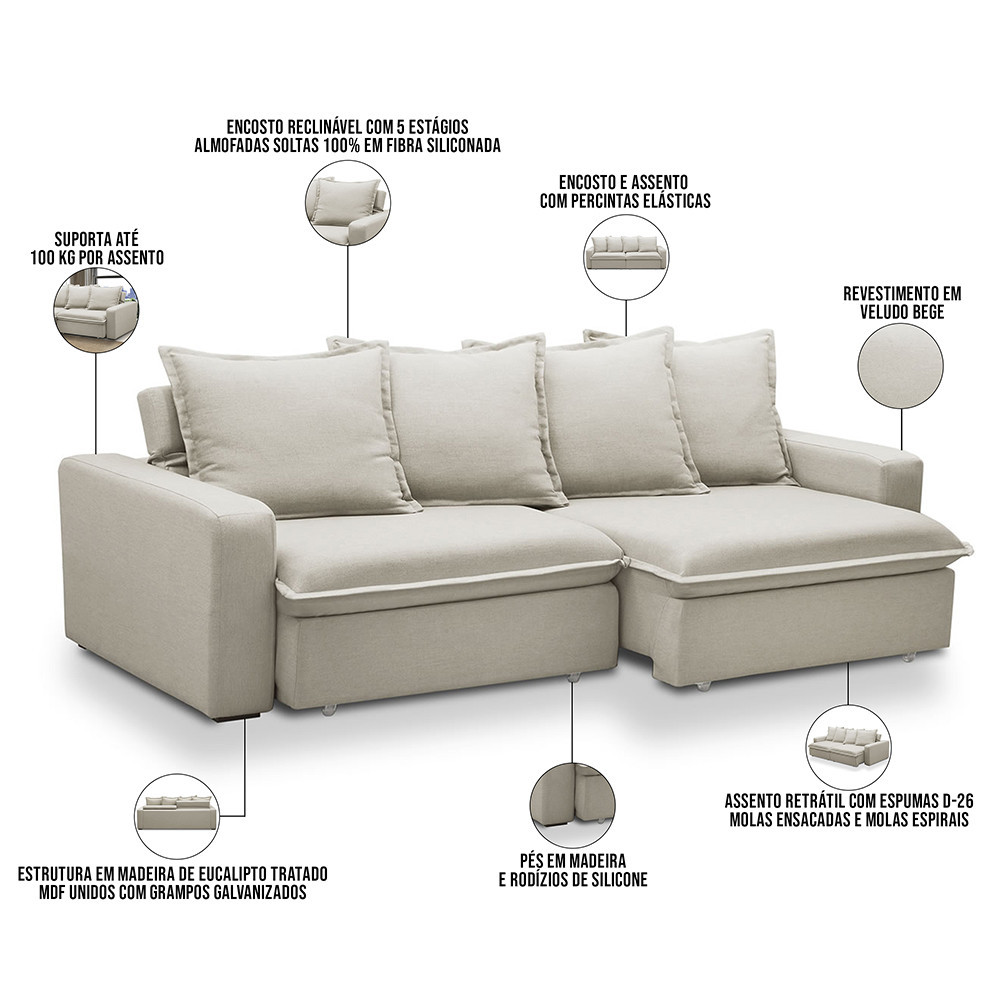 Sofá Retrátil Reclinável Para Sala de Estar Living 195cm Vêneto F04 Veludo Bege - Lyam Decor