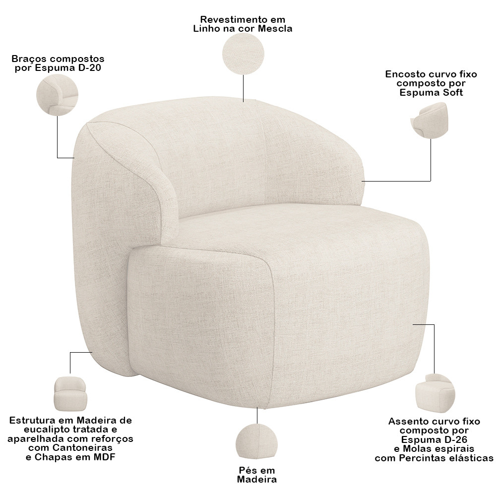 Poltrona Decorativa Fixa Orgânica Para Sala Living Barolo L06 Linho Mescla - Lyam Decor
