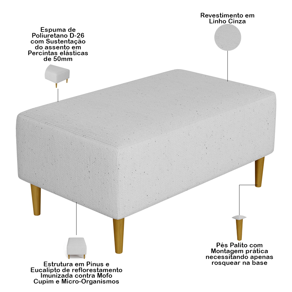 Puff Decorativo Sala de Estar Cléo W01 Pés Palito 90 cm Linho Cinza - Lyam Decor