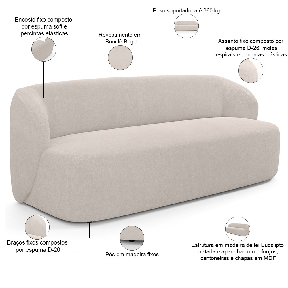 Sofá 3 Lugares Orgânico Para Sala de Estar Living 205cm Heidy F04 Bouclê Bege - Lyam Decor