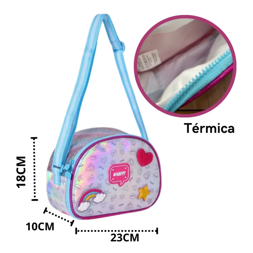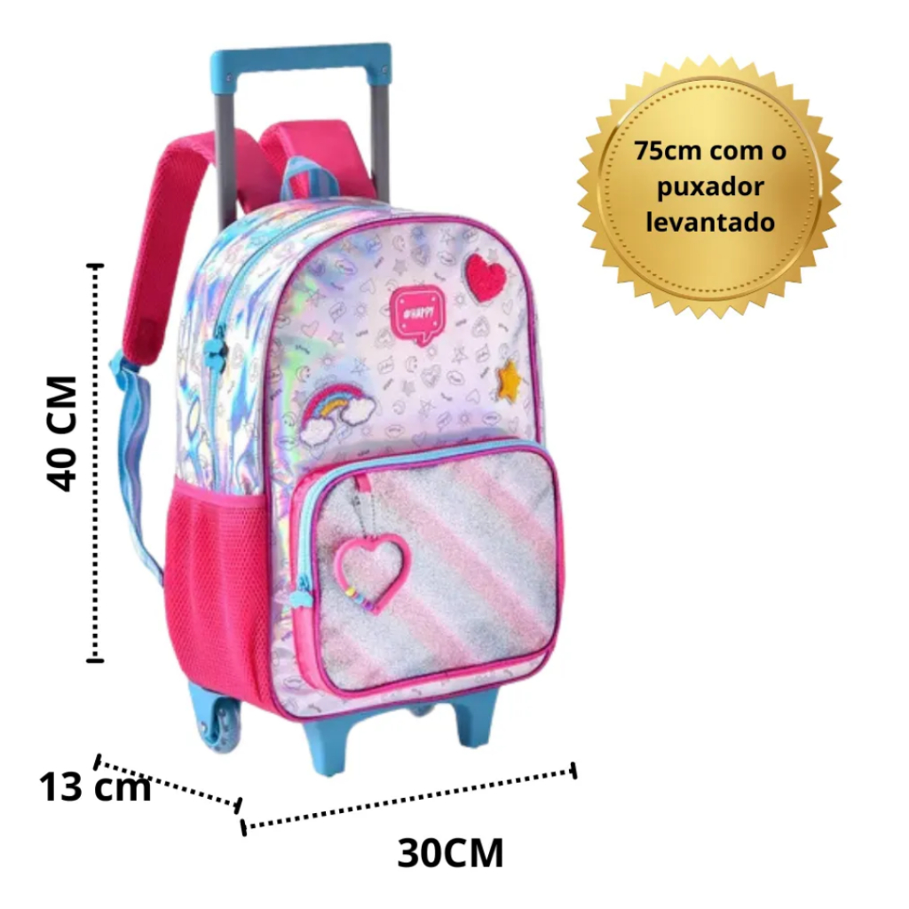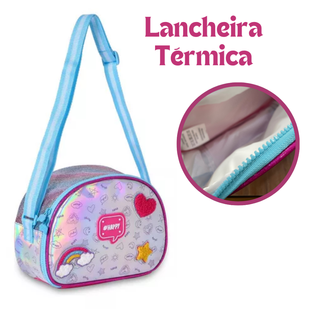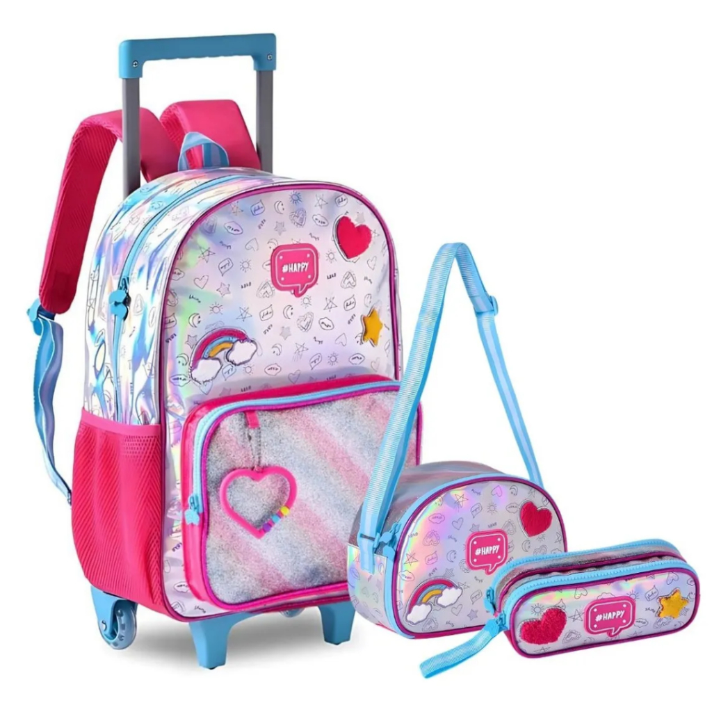 Kit Holográfico Mochila Escolar de Rodinha Lancheira Térmica e Estojo Clio